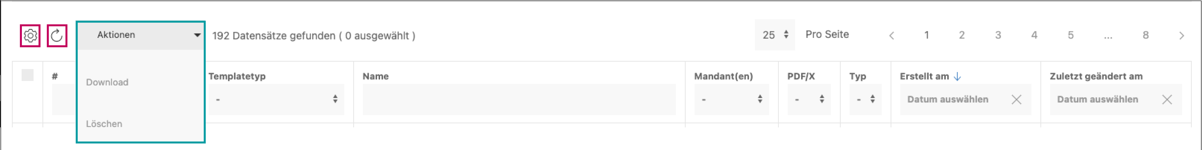 Zusätzlich können in einigen Menüs die Datensätze über die Checkboxen links aktiviert und mittels Aktionen heruntergeladen oder gelöscht werden.