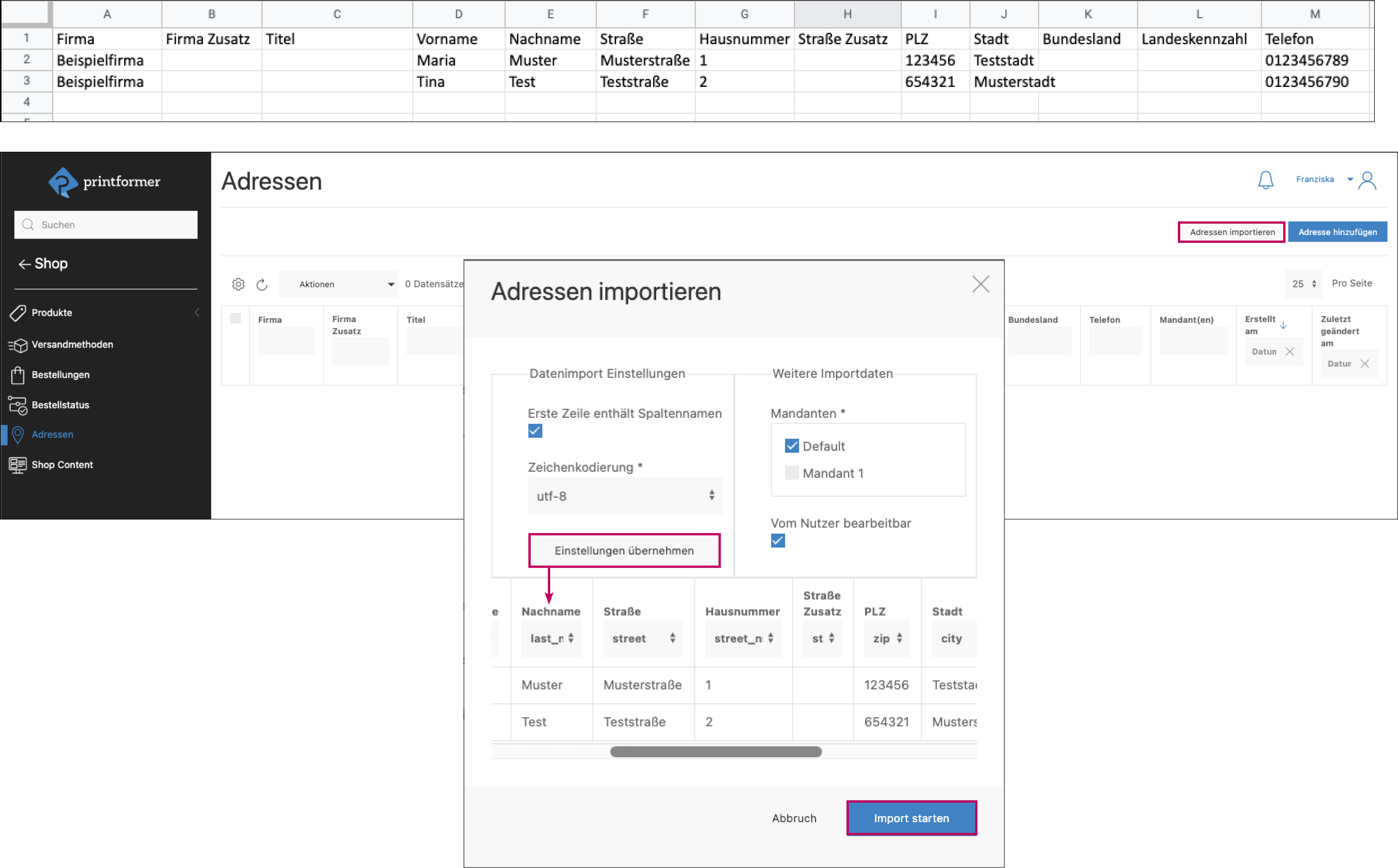 Adressen importieren: Die Adressdaten werden vorab als csv- oder excel-Datei gespeichert, dabei müssen alle Daten-Felder des printformers vorhanden sein, auch wenn dafür kein Inhalt existiert (bspw. State Code). Um den Import zu starten müssen alle Felder ausgefüllt und auf Einstellungen übernehmen geklickt werden. Danach werden die Spaltennamen den printformer Data Keys zugewiesen und der Import kann gestartet werden.