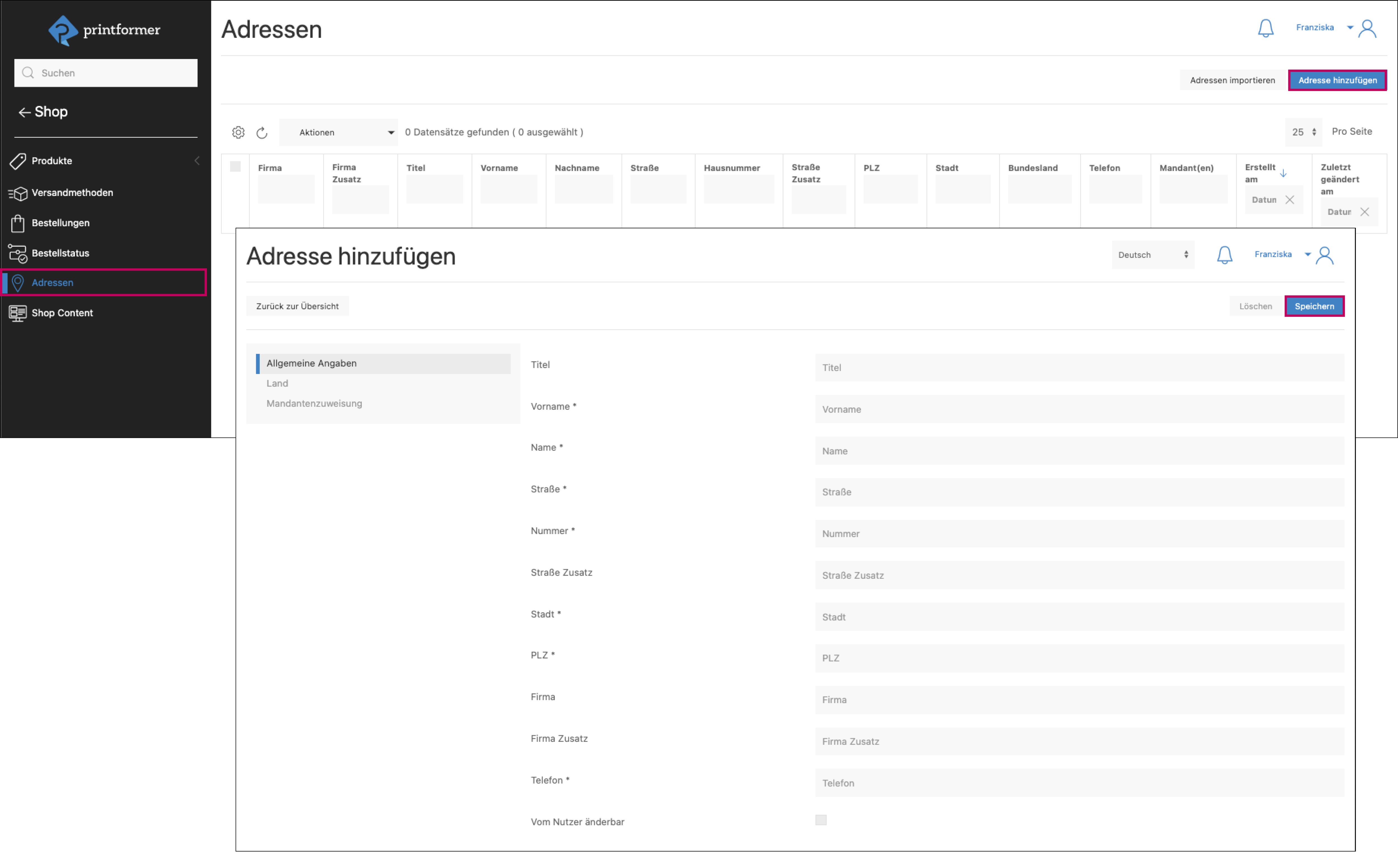 Adresse hinzufügen: unter Allgemeine Angaben werden die Daten eingegeben, optional einem (Bundes-/) Land und verpflichtend einem oder mehreren Mandanten zugewiesen.