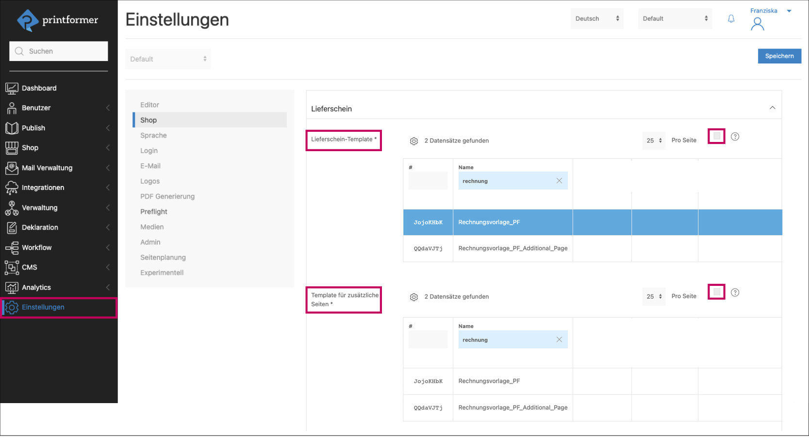In den Einstellungen unter Shop > Rechnung bzw. Lieferschein können jeweils zwei Templates zugewiesen werden; für die erste Seite (inkl. Briefkopf) sowie für jede weitere Seite.