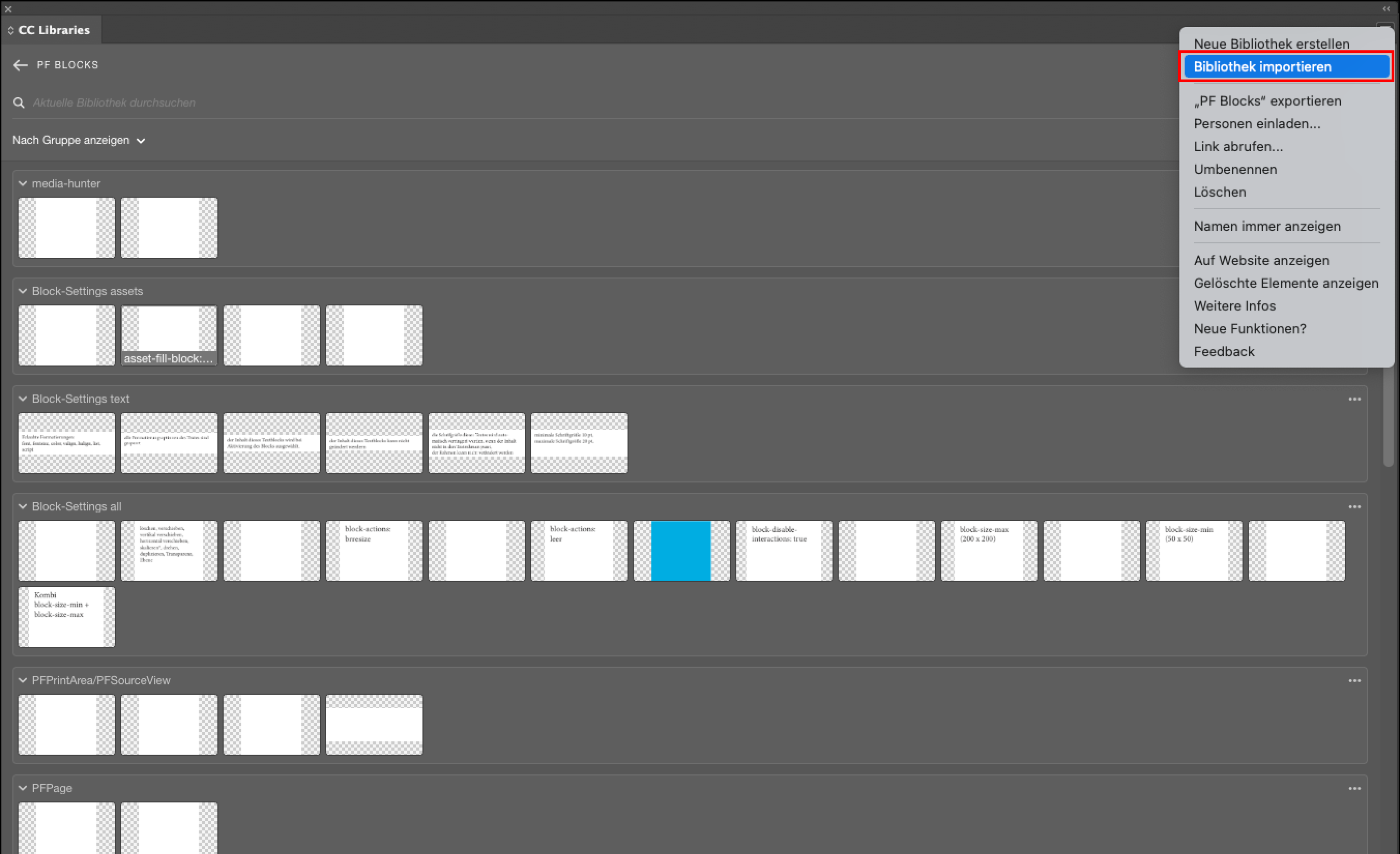 Die CC Library kann auch für bereits getagte Elemente verwendet werden; diese können per drag&drop direkt in das Libraries-Fenster gezogen (und benannt) werden, und dann für neue Dokumente wieder platziert werden.