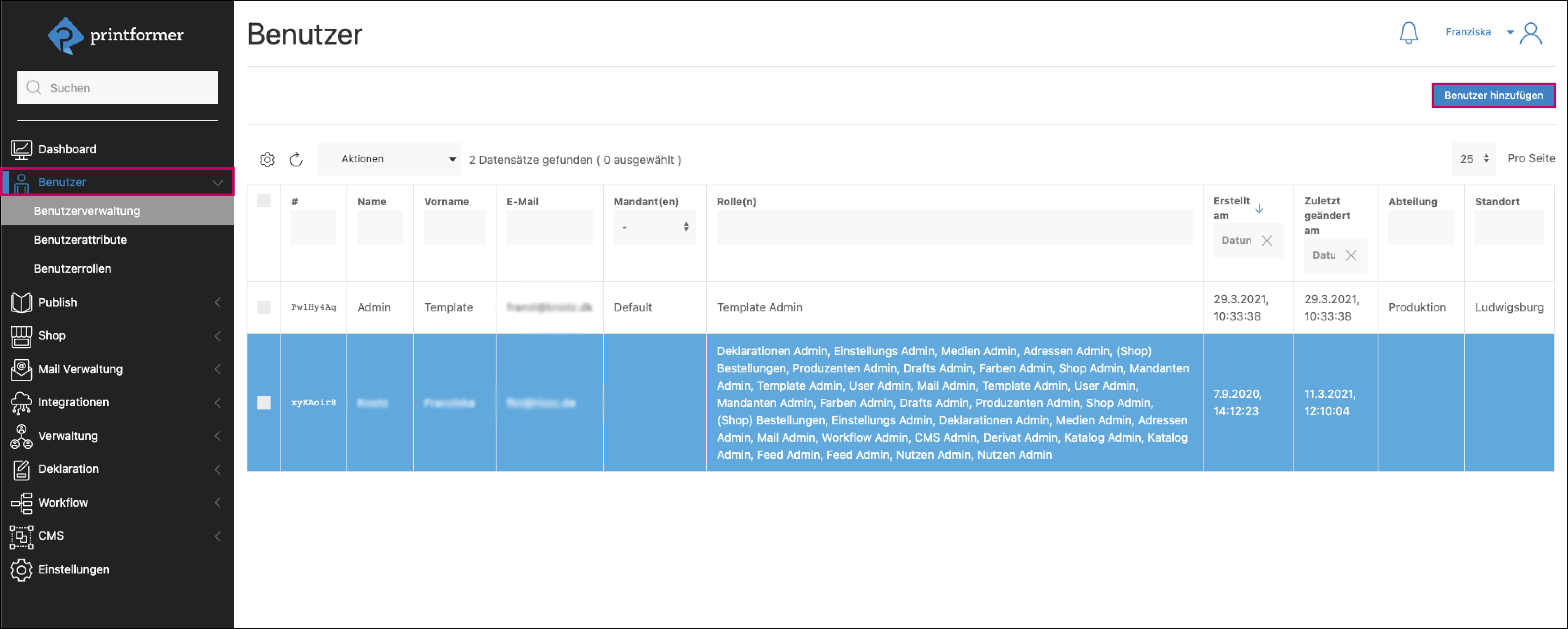 Unter dem Menüpunkt Benutzer findet die Benutzerverwaltung und das Anlegen von Benutzerattributen und -rollen statt. Jeder neue Benutzer besitzt Admin-Rechte, die durch die Benutzerrollen erweitert oder eingeschränkt werden können. Außerdem ist jeder Benutzer mindestens einem Mandanten zugeordnet.