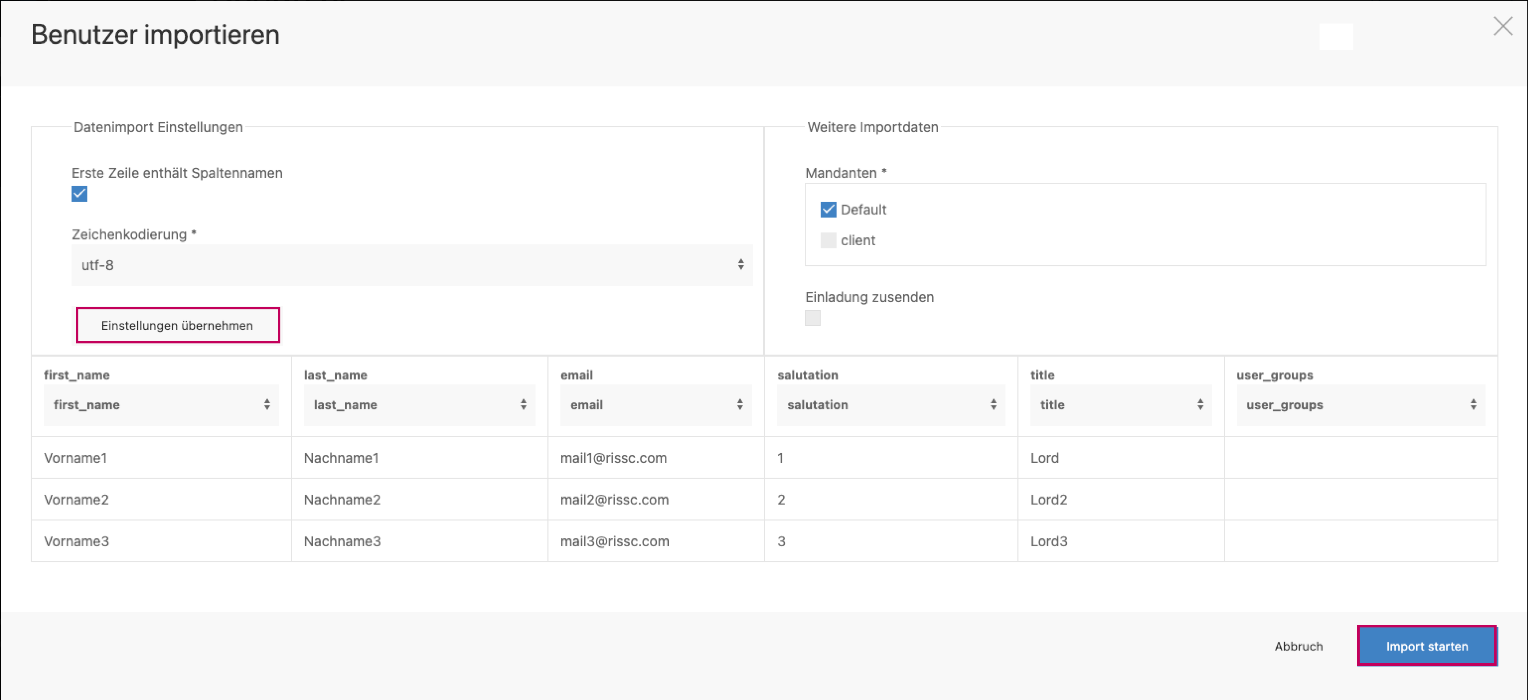 Die CSV-Datei muss dazu die Spalten first_name, last_name, email, salutation und title beinhalten.