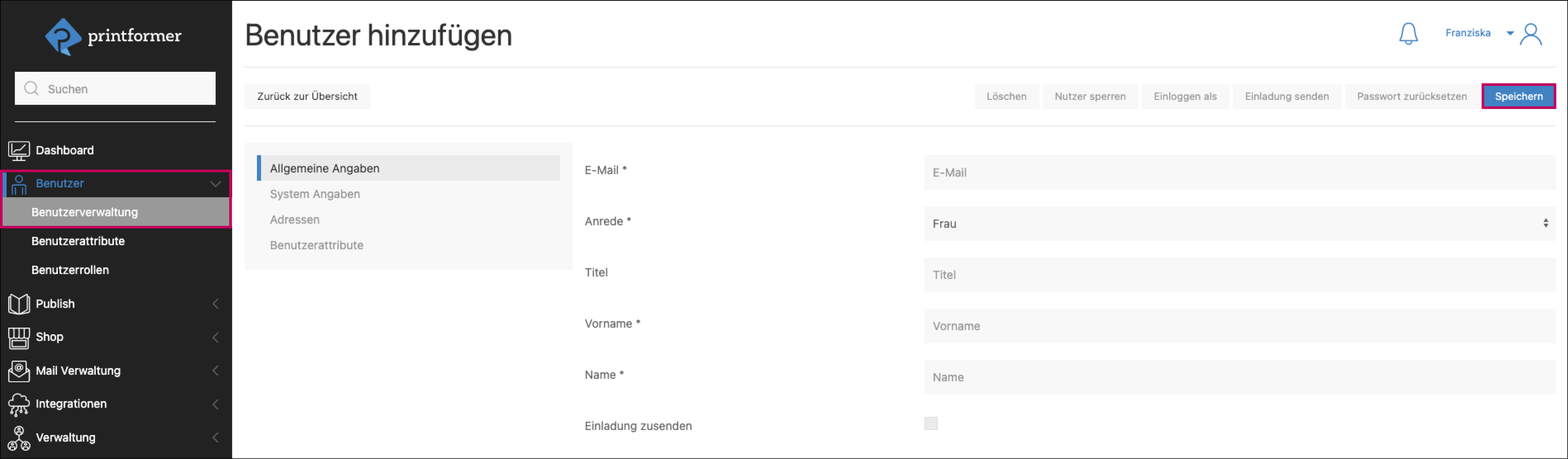 Die Menüpunkte Löschen, Nutzer sperren, Einloggen als, Einladung senden, Passwort zurücksetzen im oberen Bereich werden aktiviert sobald der Benutzer angelegt wurde und er erhält einen Identifier.
