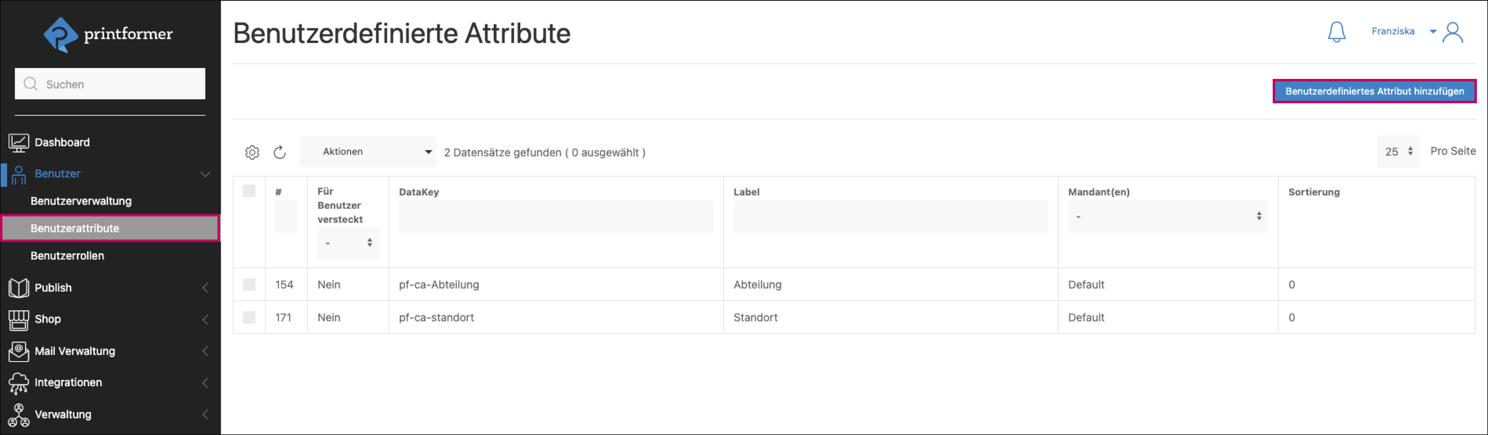 Ein Benutzerattribut ist ein selbst definiertes Attribut, dass je nach Benutzer einen unterschiedlichen Wert annehmen kann (z.B. Filialenstandort, Region, etc.). Die Zuweisung erfolgt über die Mandantenauswahl. So kann ein Benutzerattribut einem oder mehreren Mandanten zugewiesen werden. Es wird ein Standard Wert definiert, der dann für jeden Benutzer angepasst werden kann. Wird beispielsweise das Benutzerattribut Ort mit dem Standard Stuttgart angelegt, erscheint dieser Wert bei allen ausgewählten Mandanten. Dieser Wert kann für jeden Benutzer über die Benutzerverwaltung (Benutzerverwaltung > Benutzer auswählen > Benutzerattribute) individualisiert werden.