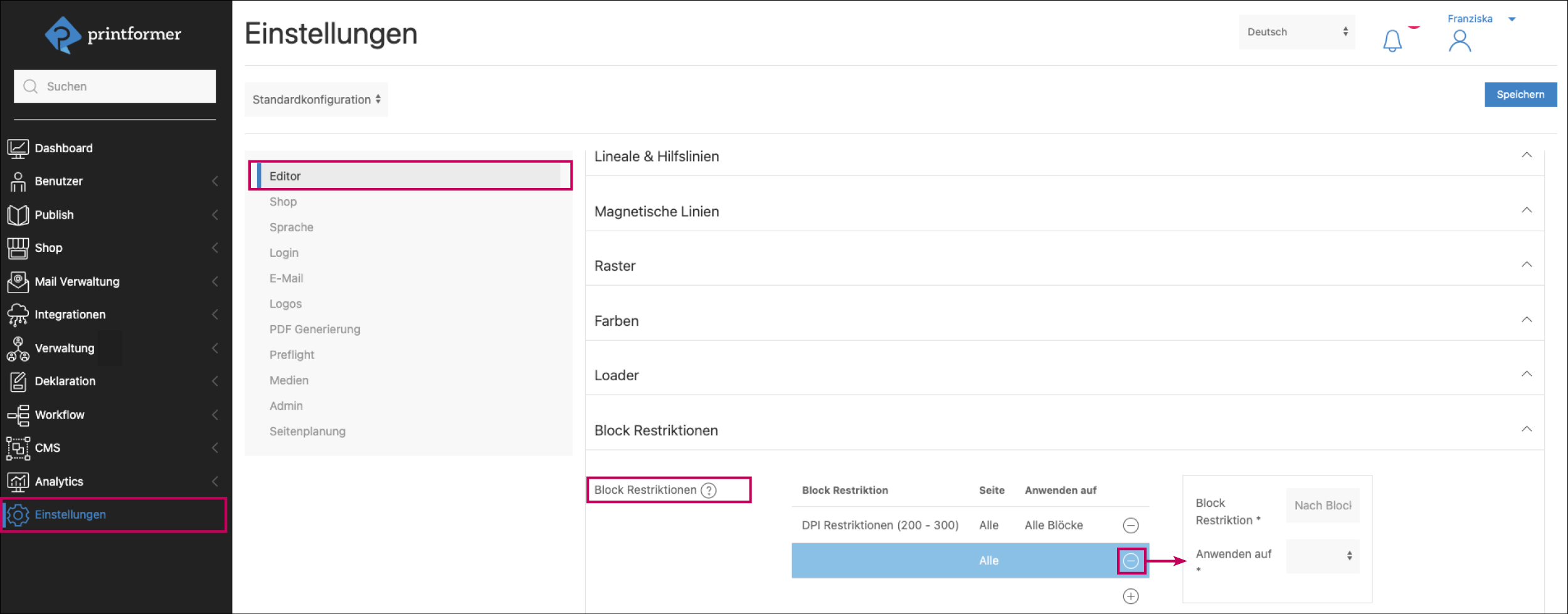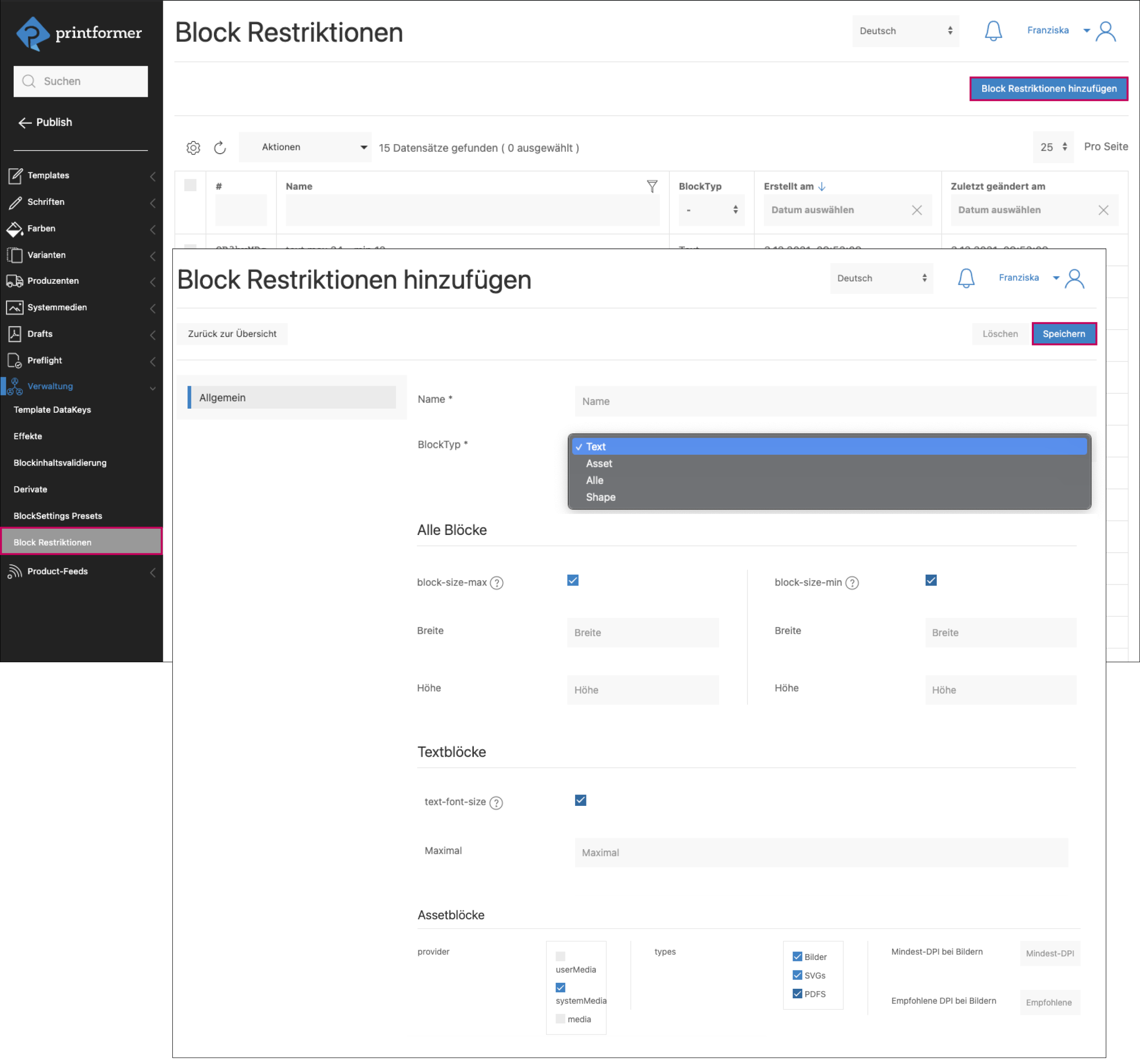 Je nach Auswahl unter BlockTyp greift die Restriktion jeweils für Text-, Asset-, Shape-Blöcke oder für alle Blöcke zusammen.