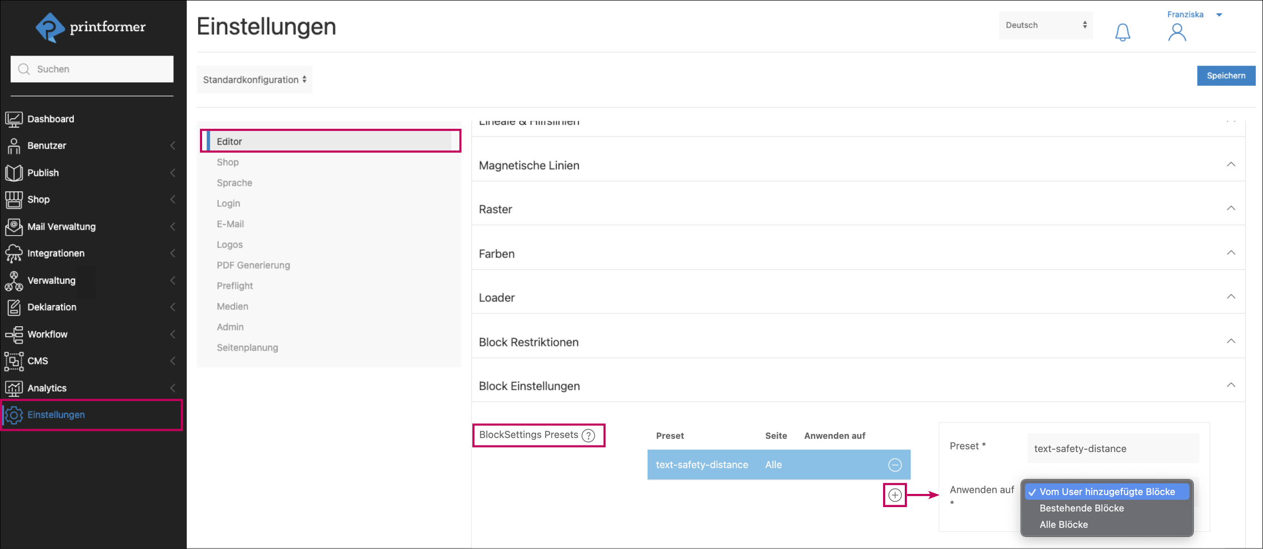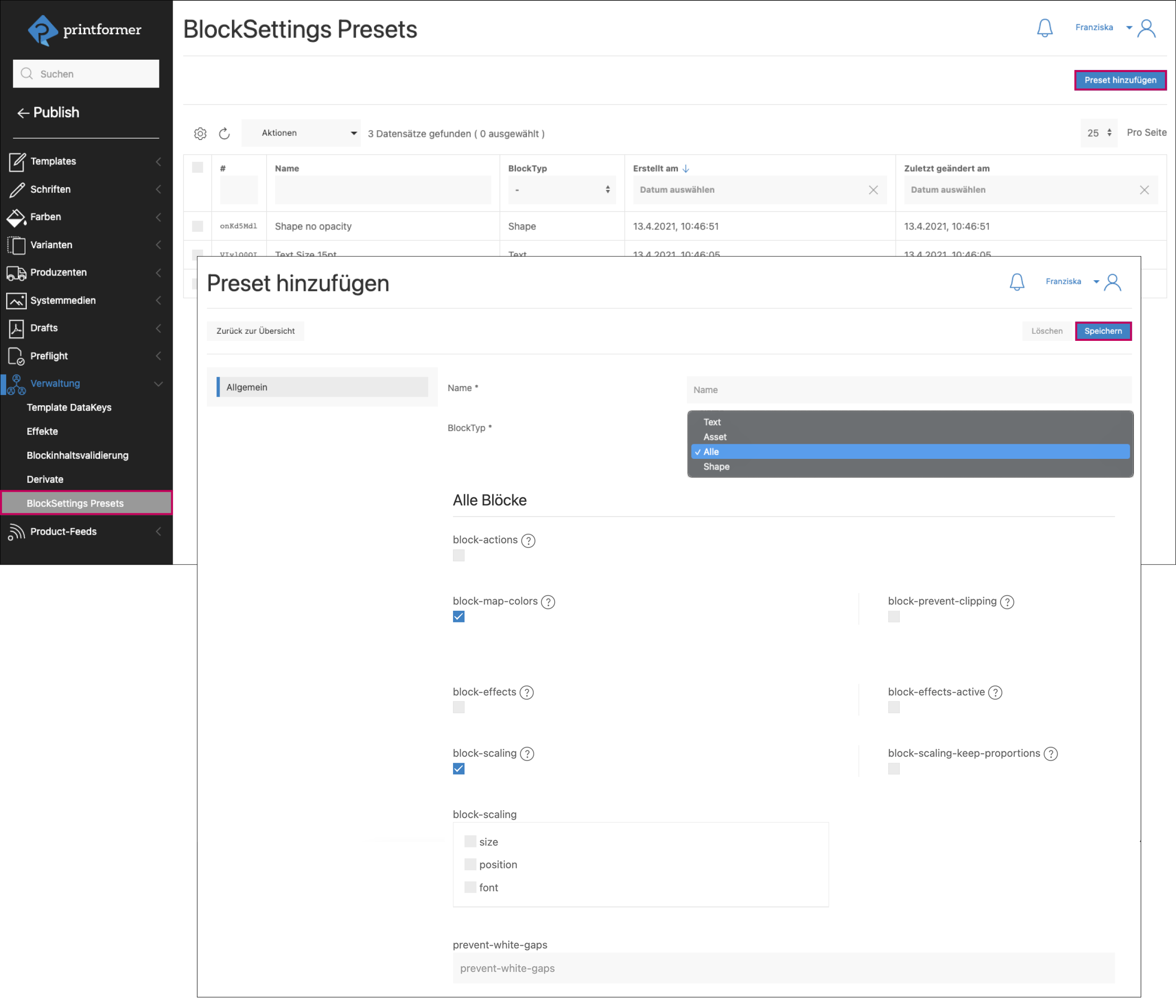 Zunächst wird ein Name vergeben sowie ausgewählt für welchen BlockTyp (Text, Asset, Shape oder alle) die Settings gelten sollen.