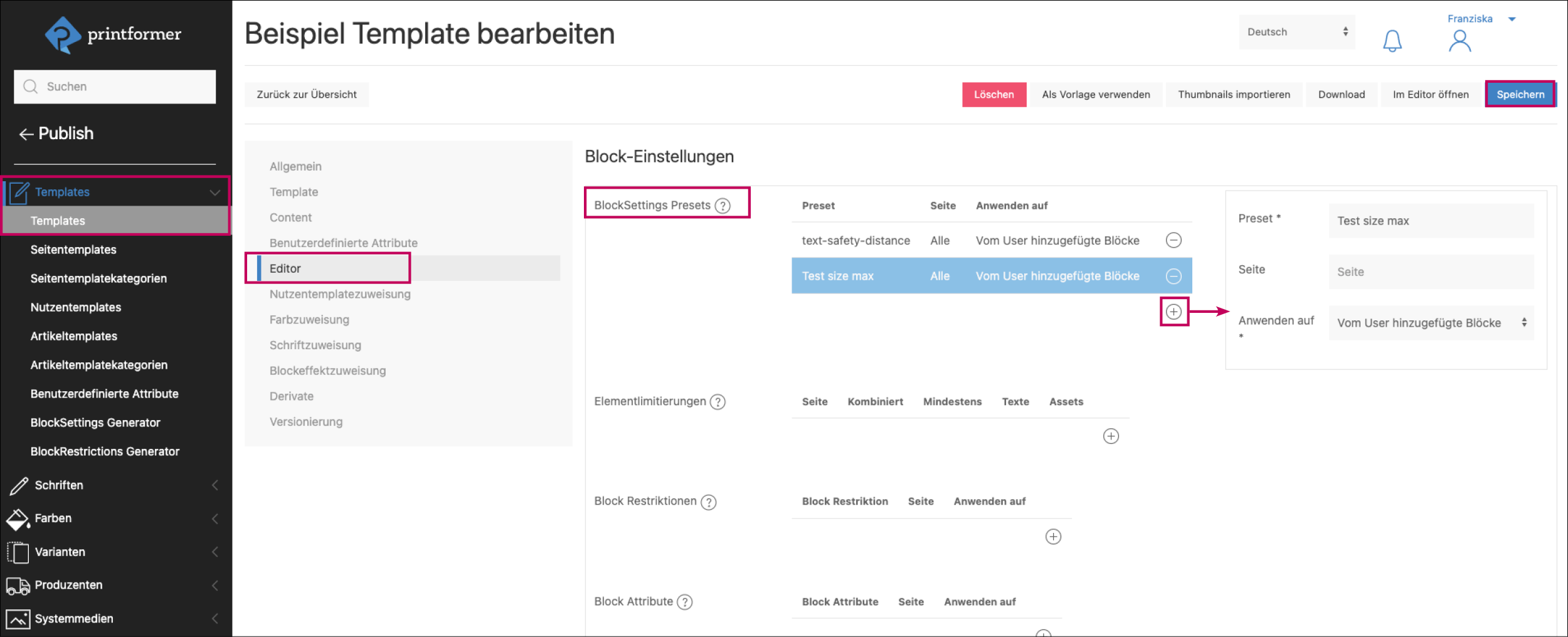 Die Settings block-size-max/min, text-font-size max/min befinden sich nun im Menü Block Restriktionen. Bestehende Presets wurden bei der Anpassung automatisch als BlockRestriktion erstellt. (In der IDML können diese Restriktionen weiterhin mit dem Wert settings angegeben werden.)