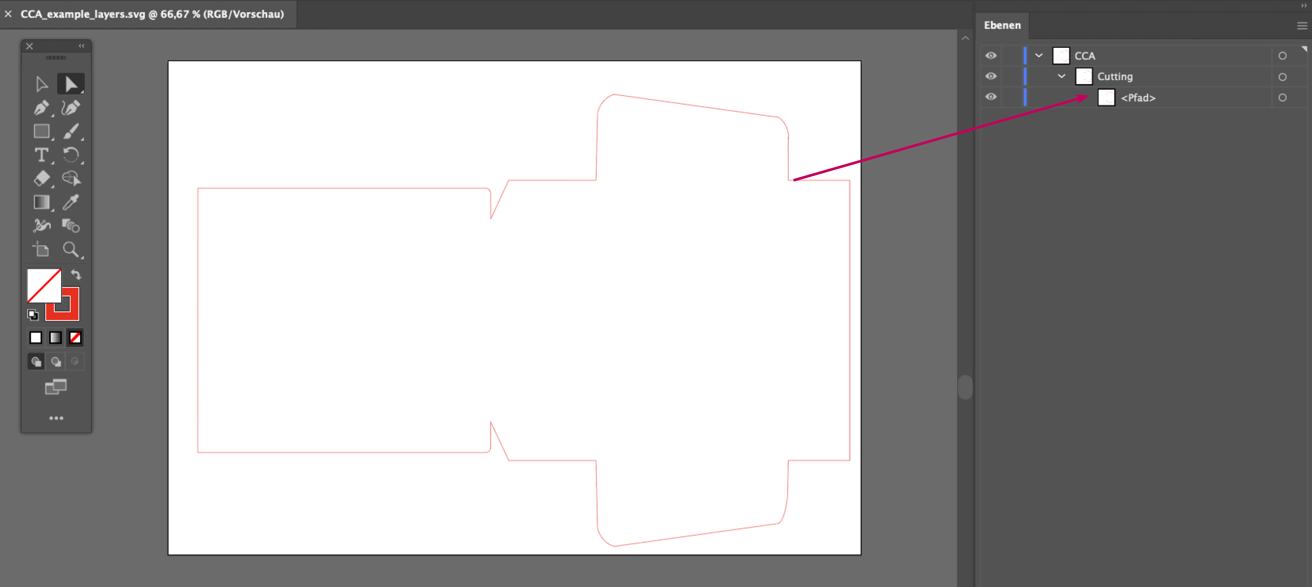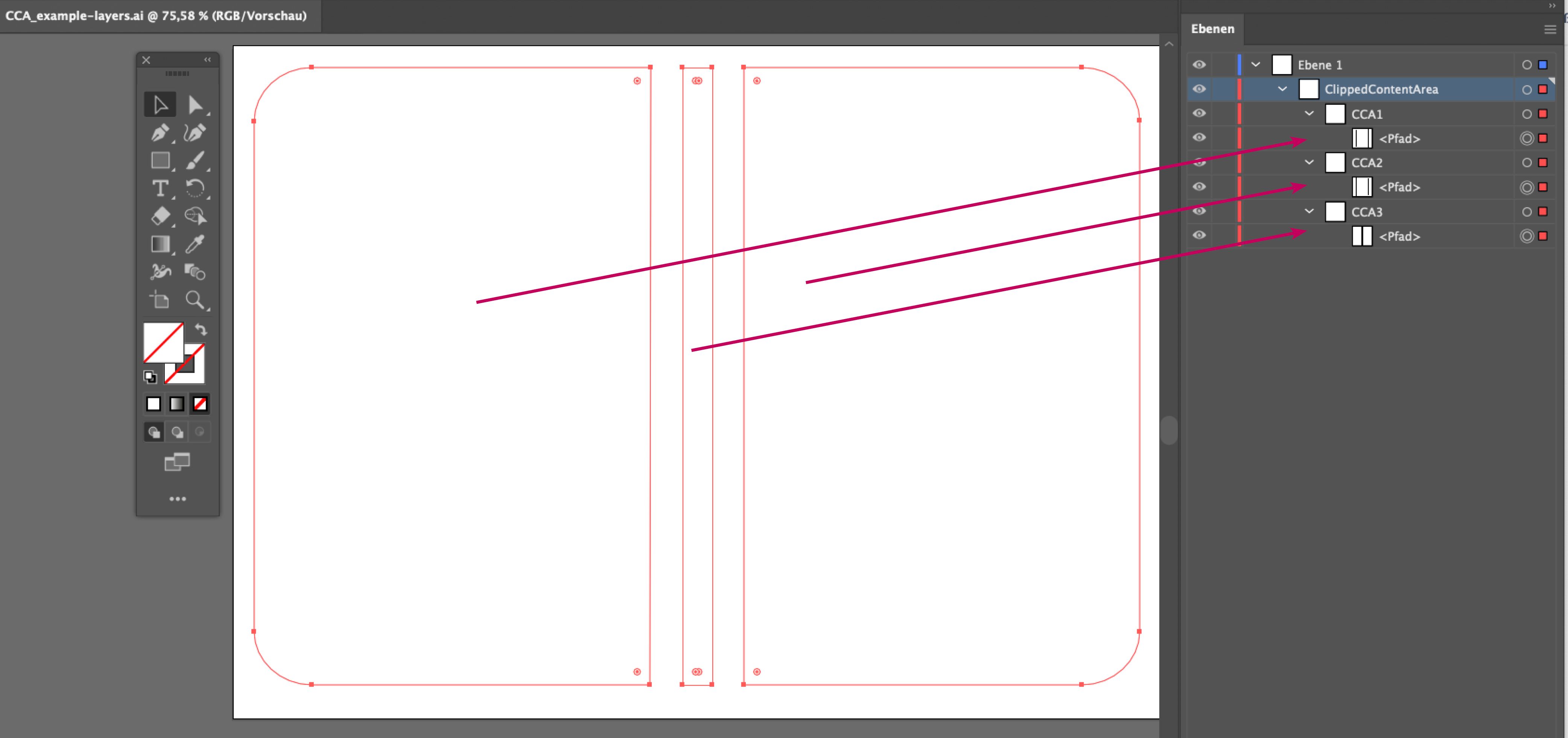 Jeder Pfad wird auf einer Unterebene der Ebene ClippedContentArea erstellt. Diese Unterebenen müssen wie im folgenden Screenshot CCA benannt und durchnummeriert werden. Die Pfade der CCAs dürfen keine Flächen- oder Konturfarbe besitzen.