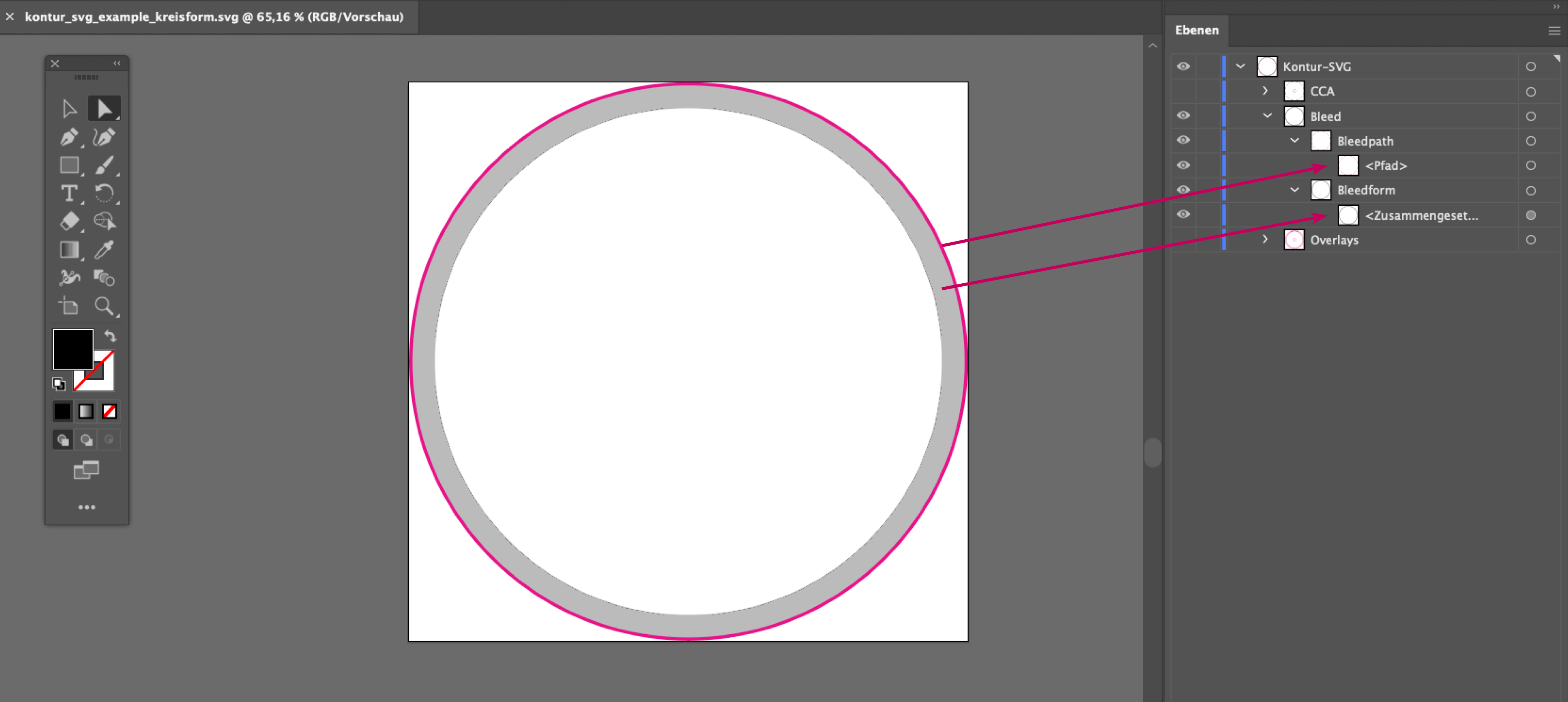 Die Elemente für die Schneidelinie (Bleedpath) und den Beschnittbereich (Bleedform) befinden sich auf Unterebenen der Ebene Bleed.