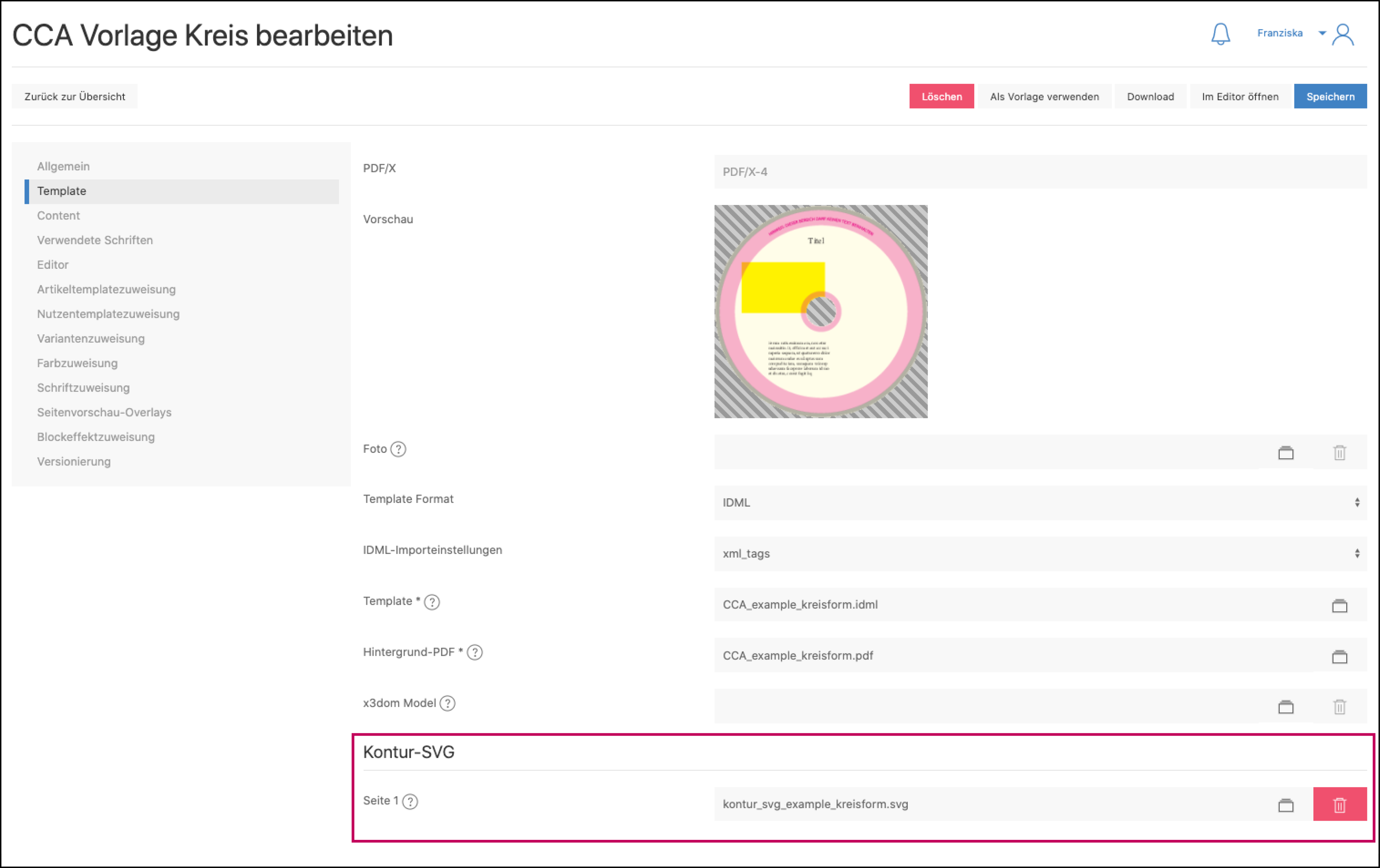 Beispiel eines Templates mit Kontur-SVG (CCA) im printformer Editor: