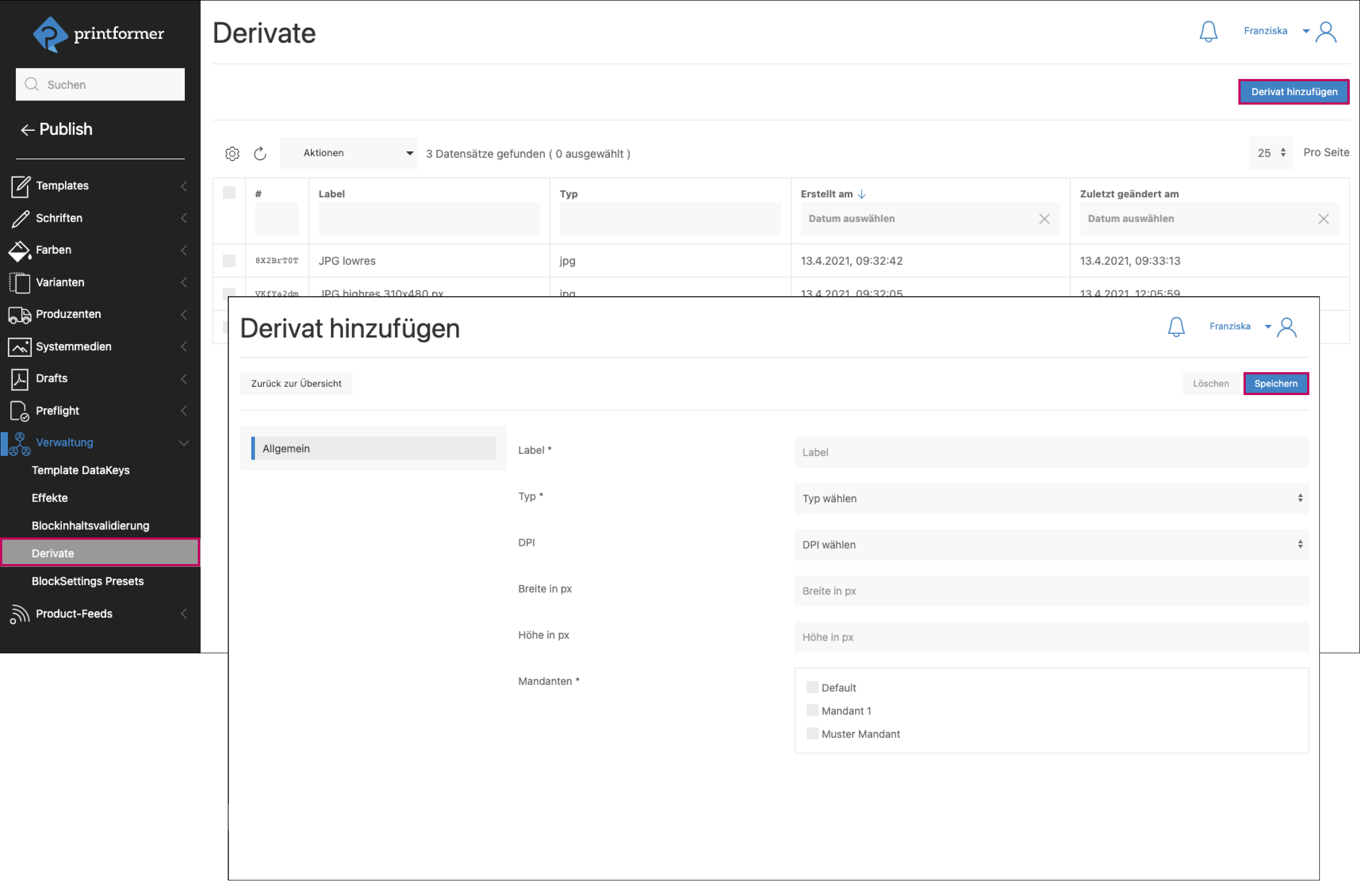 Durch Derivate können die im Editor bearbeiteten Templates als PDF, JPG oder PNG (mit vordefinierten Settings) ausgegeben werden.