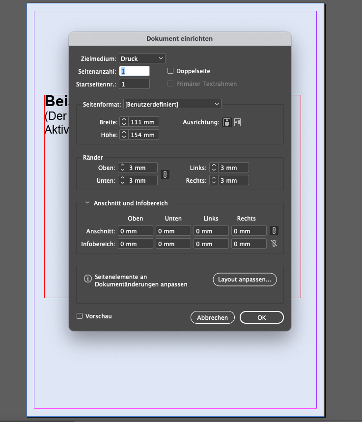 105 x 148 mm und soll 3 mm Anschnitt je Seite enthalten. Daher wird das Seitenformat der IDML-Datei mit