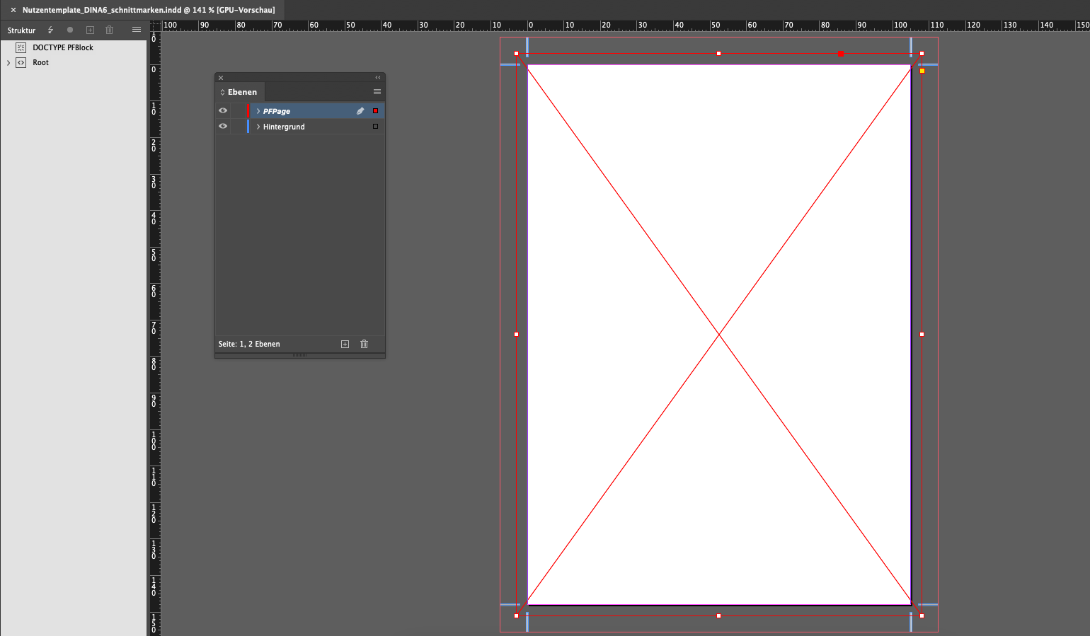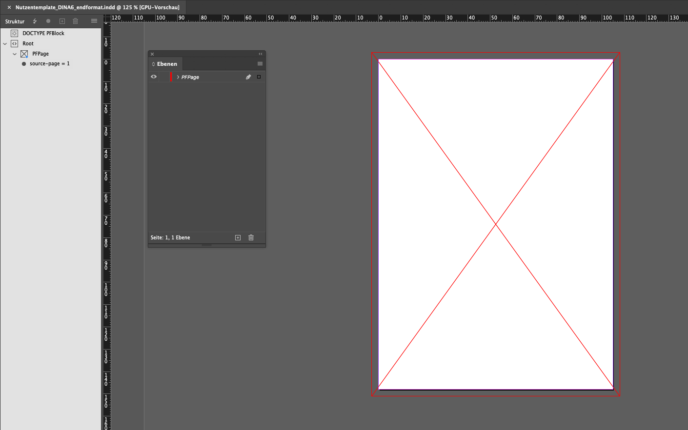 Zusätzlich wird eine weitere Ebene angelegt auf die ein Rechtecktrahmen (Seitenformat inkl. Beschnitt) mittig platziert wird. Dieser wird mit dem Tag PFPage und dem Attribut source-page versehen.