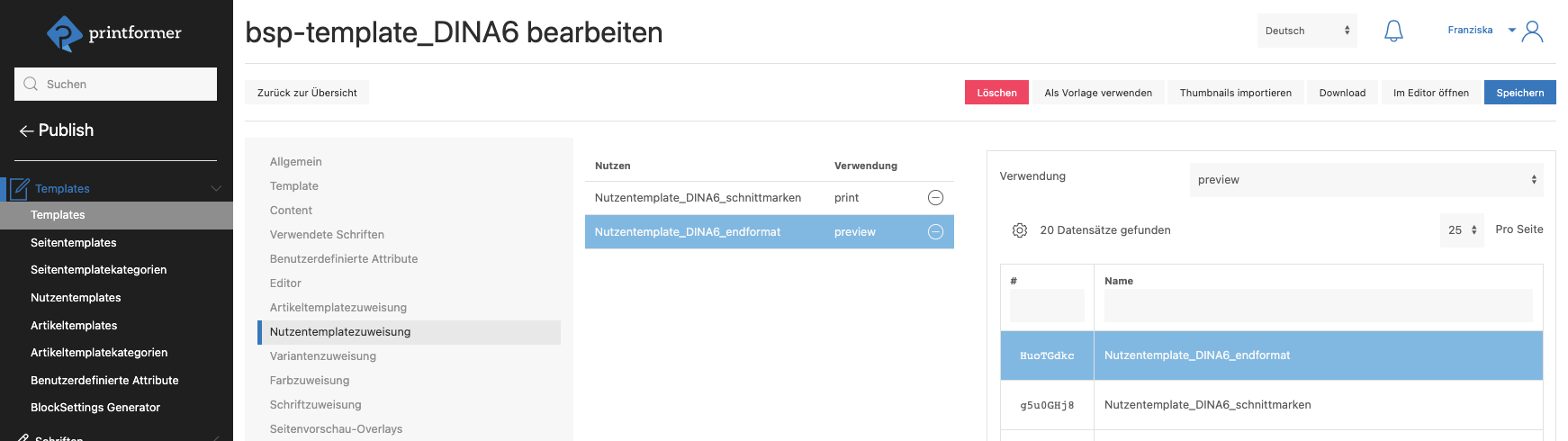 Unter Verwendung wird ausgewählt für welche PDF: Print oder Preview das jeweilige Nutzentemplate eingesetzt werden soll.