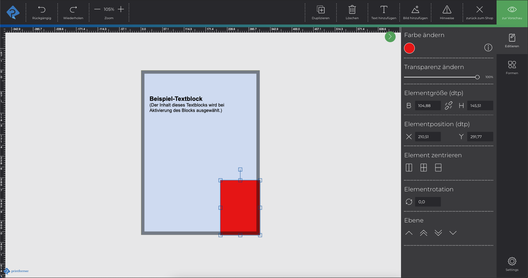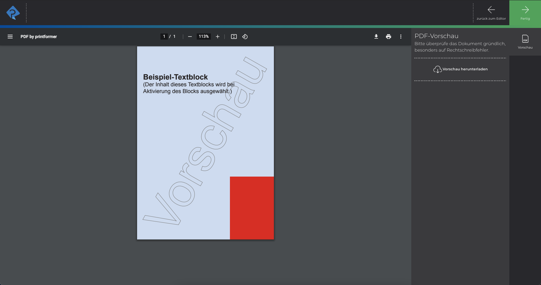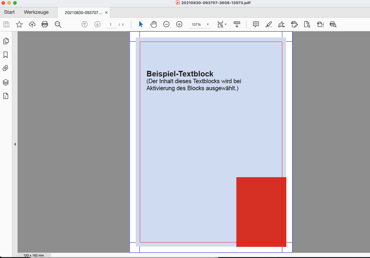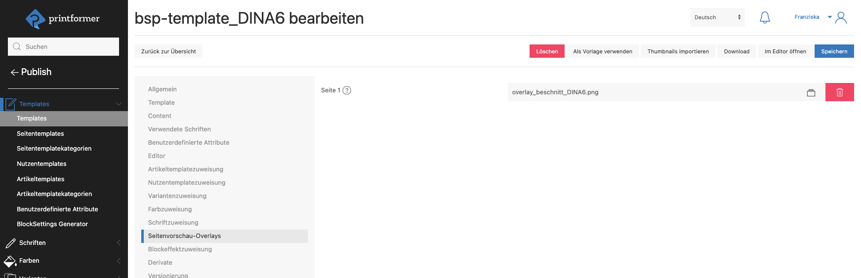 Zusätzlich kann ein Seitenvorschau-Overlay (PNG-Datei, Format: Seitenformat inkl. Beschnitt) hochgeladen werden um den Beschnittbereich im Editor farblich abzusetzen.