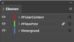 Wenn man Elemente im Editor anzeigen möchte die später jedoch nicht in der Druckdatei enthalten sein sollen, legt man im Indesign Dokument eine Ebene mit dem Namen »PFNonPrint« an. (Um die Funktion dieser Ebene zu gewährleisten muss sie exakt so benannt werden und darf keine Leerzeichen enthalten.)