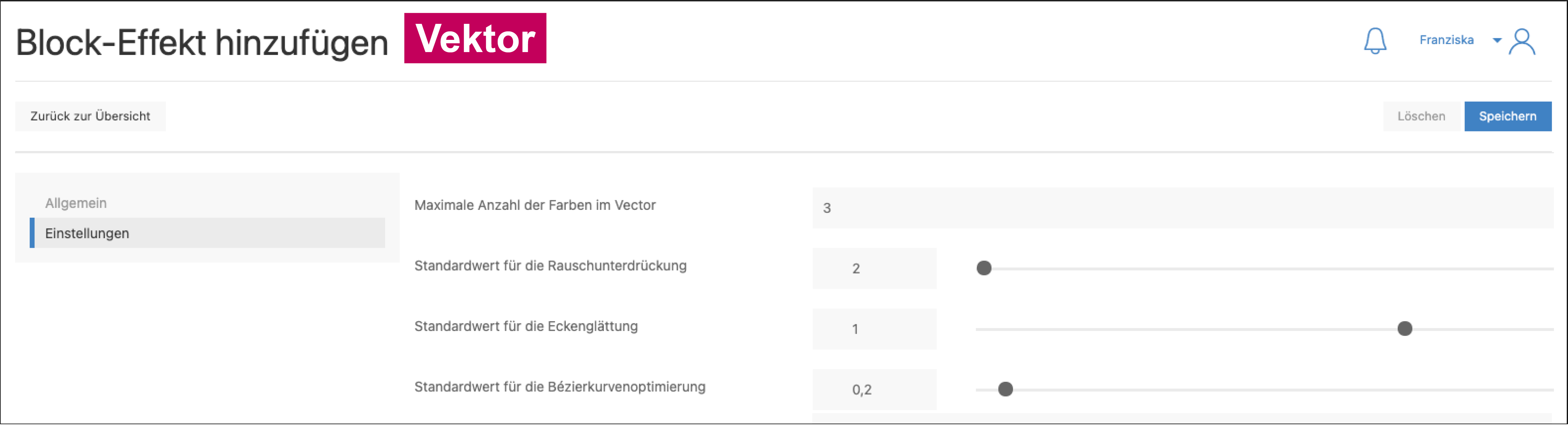 Hier wird die maximale Anzahl der Farben für die spätere Vektorgrafik festgelegt sowie die Standard-Einstellungen der Vektorisierung (Standardwert für die Rauschunterdrückung, Eckenglättung und Bézierkurvenoptimierung). Diese können bei Verwendung des BlockAttributs block-effects-active im Editor überschrieben werden.