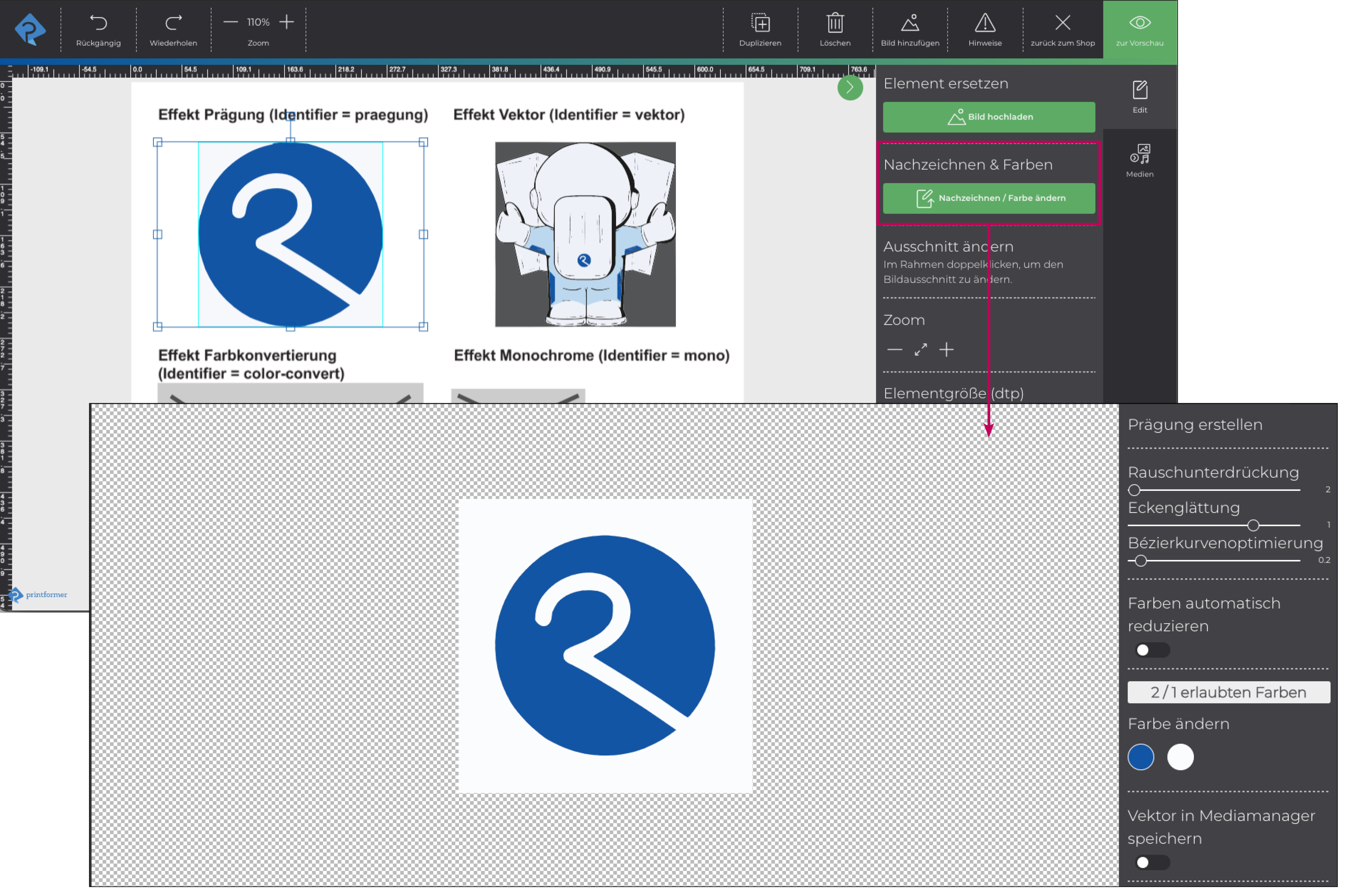 Der jeweilige Effekt wird im printformer Editor direkt beim Laden eines Assets angewandt. Bei den Effekten Prägung und Vektor öffnet sich automatisch die Einstellungsmaske. Später können über den Button Nachzeichnen/Farbe ändern nochmals Anpassungen vorgenommen werden. Über Vektor in Media Manager speichern können die vektorisierten Assets (auch für andere Templates) gespeichert werden.