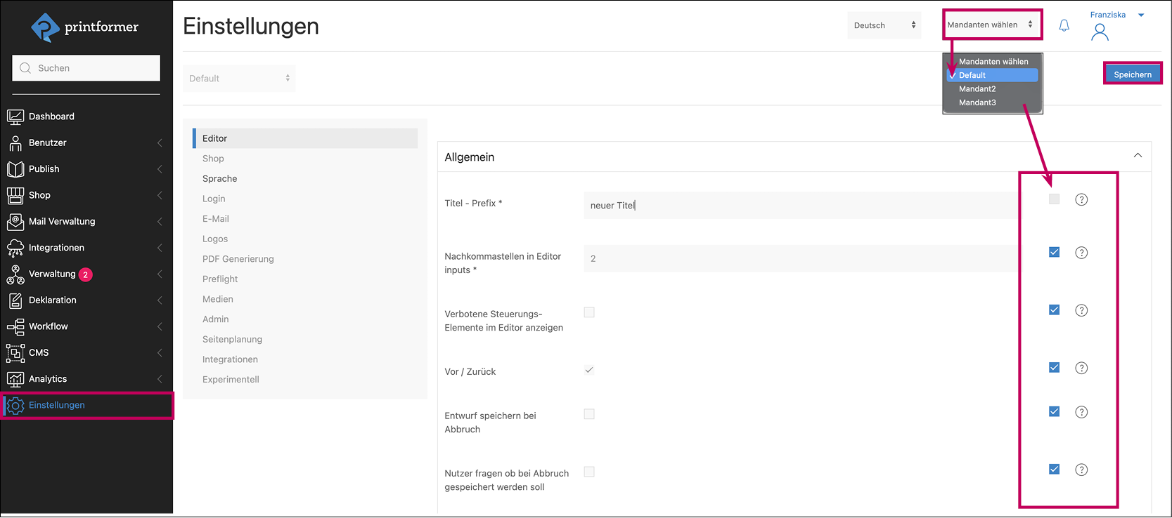 Für Systeme mit mehreren Mandanten kann im Dropdown-Menü Mandanten wählen (rechts oben) zwischen den Settings für die einzelnen Mandanten durch gewechselt werden. (Zur Individualisierung einzelner Mandanten muss zunächst die jeweilige Checkbox Standardkonfiguration verwenden deaktiviert werden.)