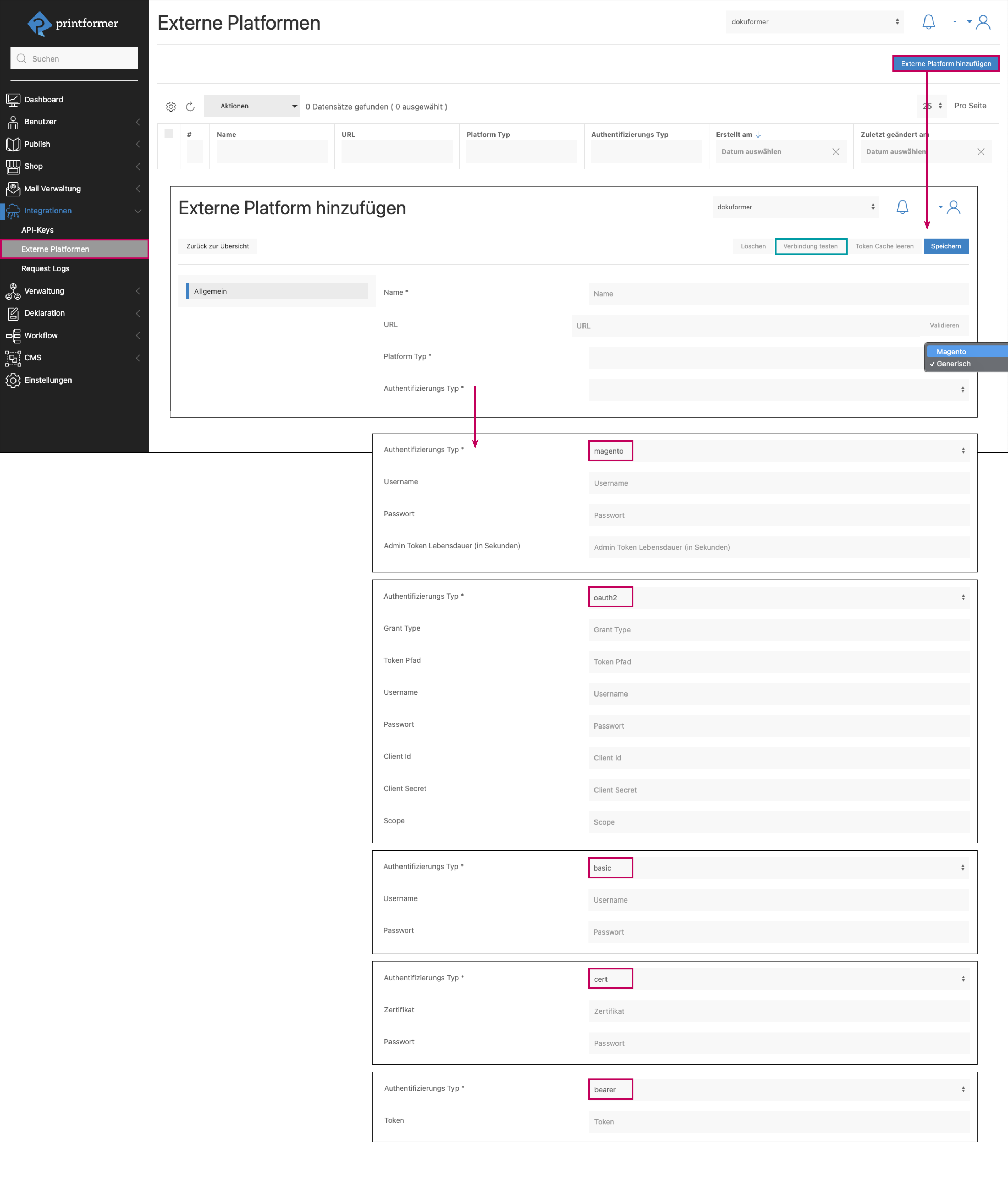 Hier können externe Plattformen (für Call-backs, bspw. Benachrichtigung-URLs die authentifiziert werden müssen oder für einen API Feed) angelegt und bereits bestehende verwaltet werden.