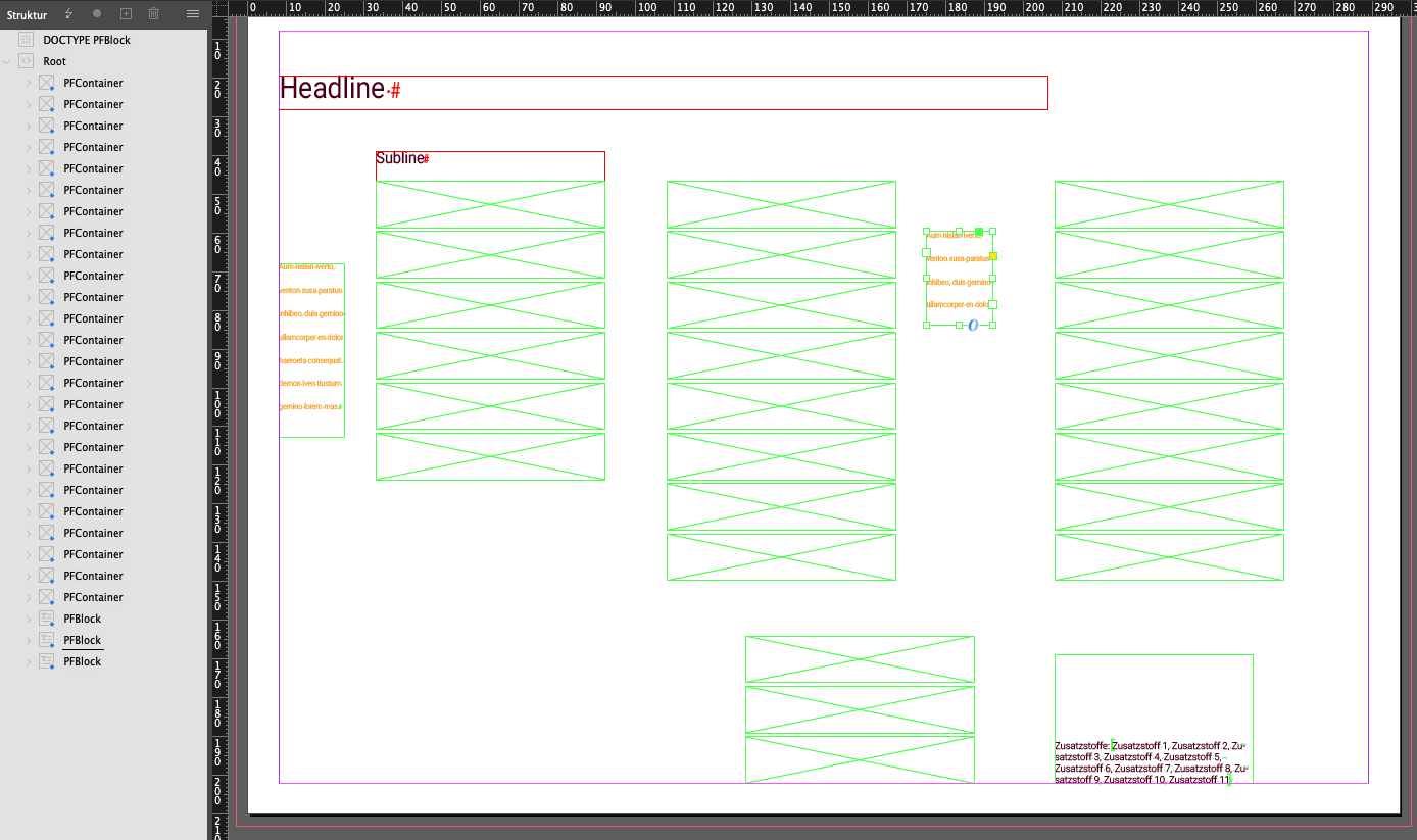 Sobald ein Produkt (Gericht oder Getränk) das einen oder mehrere Inhaltsstoffe enthält in einem Container platziert wird, werden entsprechende Verweise (Ziffern) eingefügt. Ein weiterer Textblock wird parallel dazu mit einer Legende (den Ziffern zugeordneten Inhaltsstoffen) befüllt.