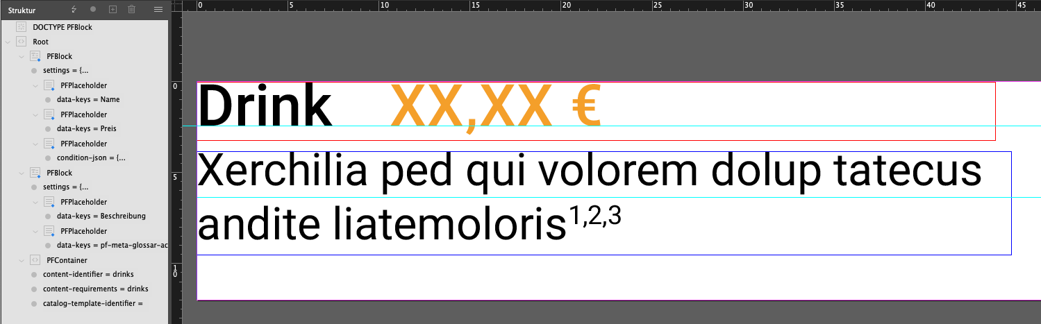 Im Artikeltemplate werden wie üblich Platzhalter erstellt, die mit DataKeys aus der Feed-Datei befüllt werden. Für den Verweis auf die jeweiligen Inhaltstoffe wird ein zusätzliche Platzhalter (wenn gewünscht Formatierung Hochgestellt) erstellt und mit folgendem DataKey ausgewiesen:
