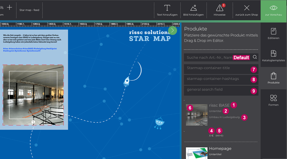 Über das Feature Seite automatisch befüllen (das über die allgemeine Einstellung > Seitenplanung aktiviert werden kann) müssen Produkte nicht einzeln in die Container gezogen werden.
