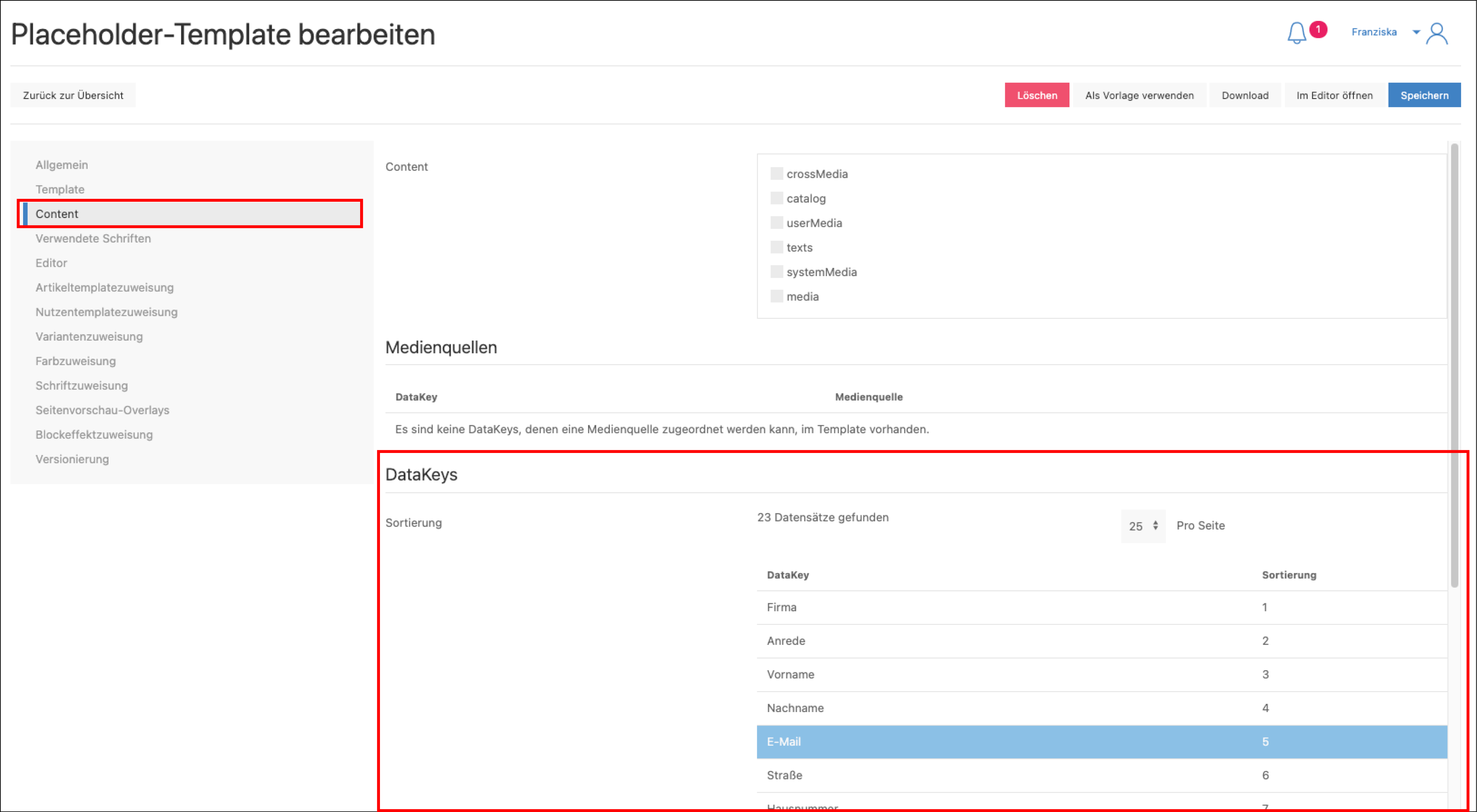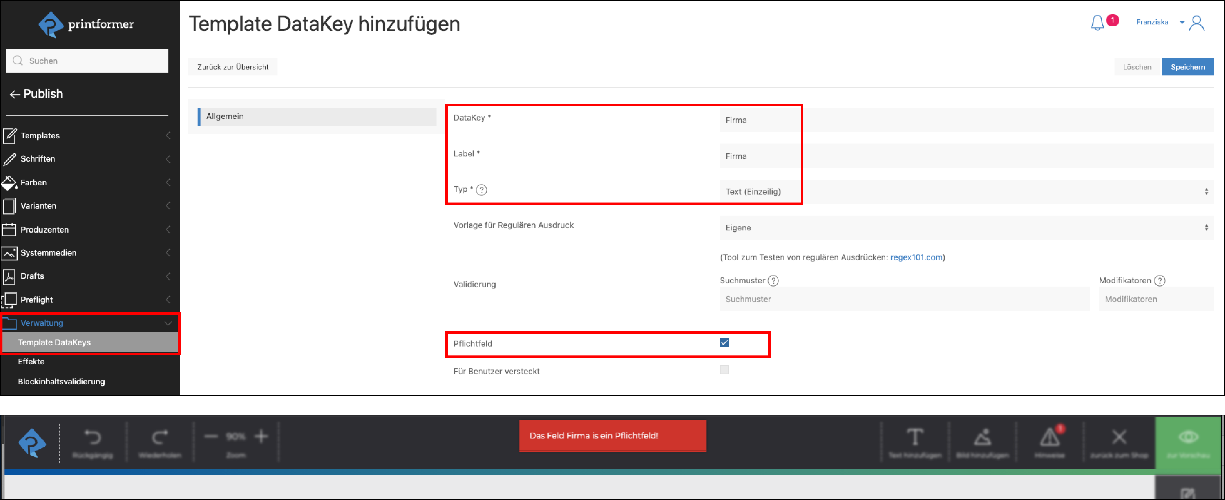 Im Menü Template DataKeys (Publish > Verwaltung > Template DataKeys) können weitere Eigenschaften der DataKeys festgelegt werden bspw. ob das Eingabefeld ein- oder mehrzeilig ist, welches Label angezeigt werden soll und ob es sich um ein Pflichtfelder handelt. Werden diese bei der Bearbeitung des Templates im Editor ausgelassen erscheint ein Hinweis sobald auf die Vorschau geklickt wird.