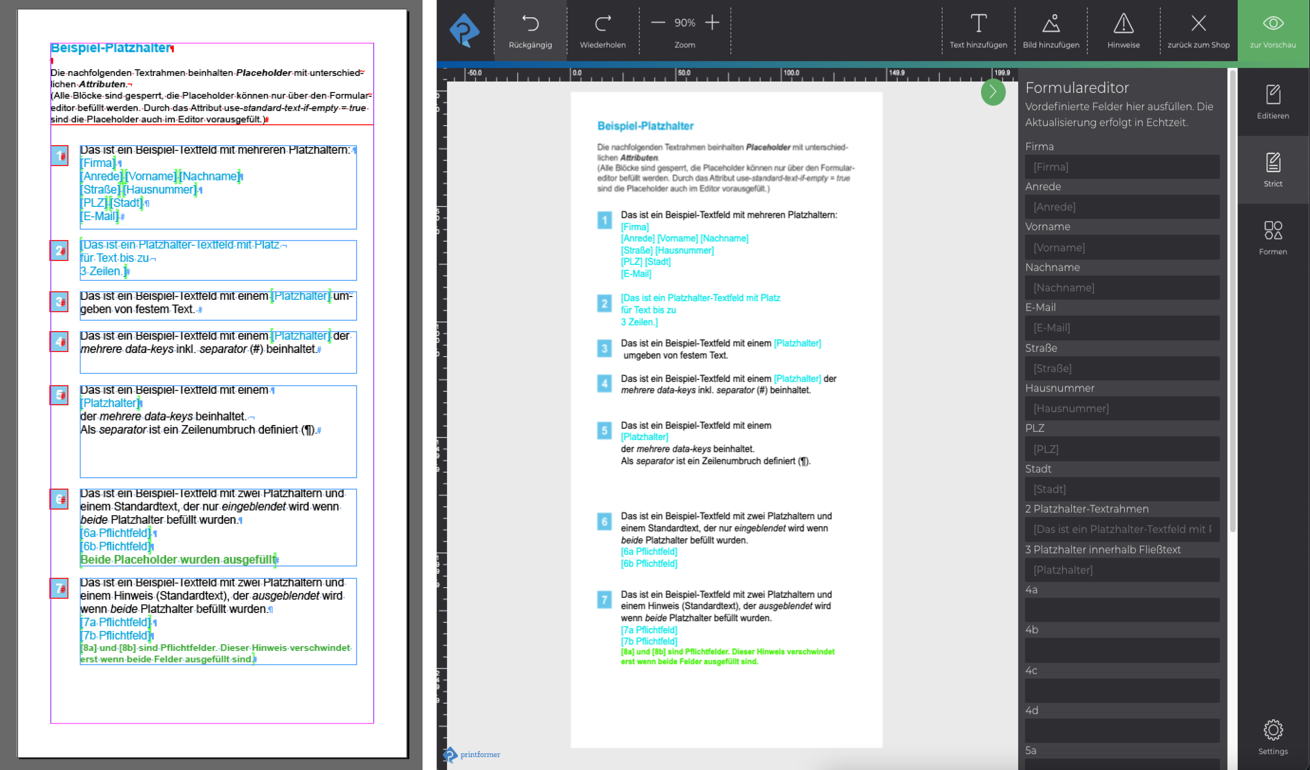 Die gewünschten Textrahmen werden mit PFBlock getaggt und zusätzlich werden die Text-Platzhalter mit dem Tag PFPlaceholder versehen. Jedem einzelnen PFPlaceholder-Tag wird dann das Attribut Name: data-keys zugewiesen. Die data-keys sind frei wählbar und erscheinen im printformer als Felder im Formulareditor (Strict), siehe auch Text-Platzhalter.