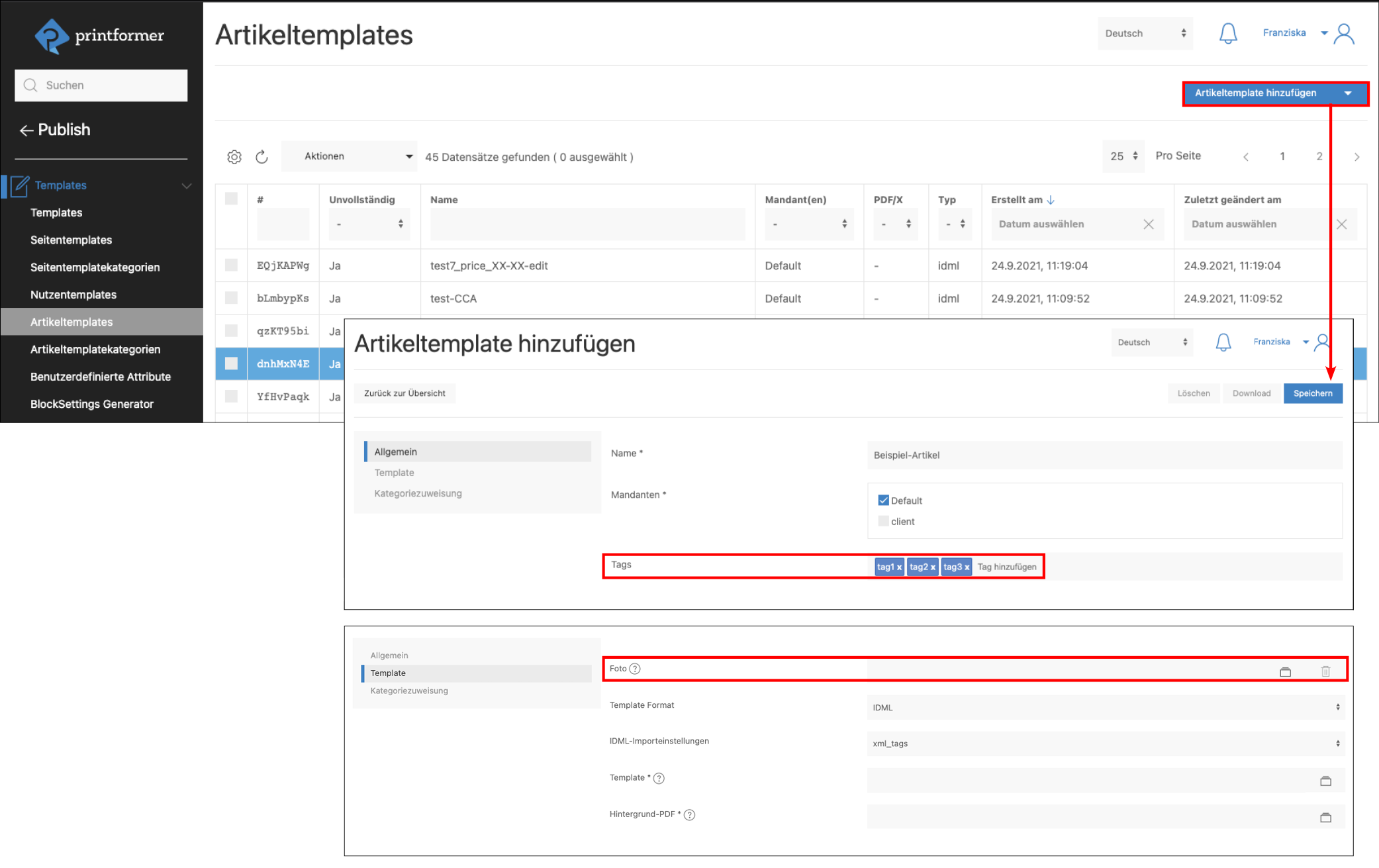 Das Erstellen eines Seiten-, Nutzen- oder Artikeltemplates erfolgt analog zur Erstellung eines Templates (die Dateien können als ZIP-Archiv oder einzeln in den printformer geladen werden).