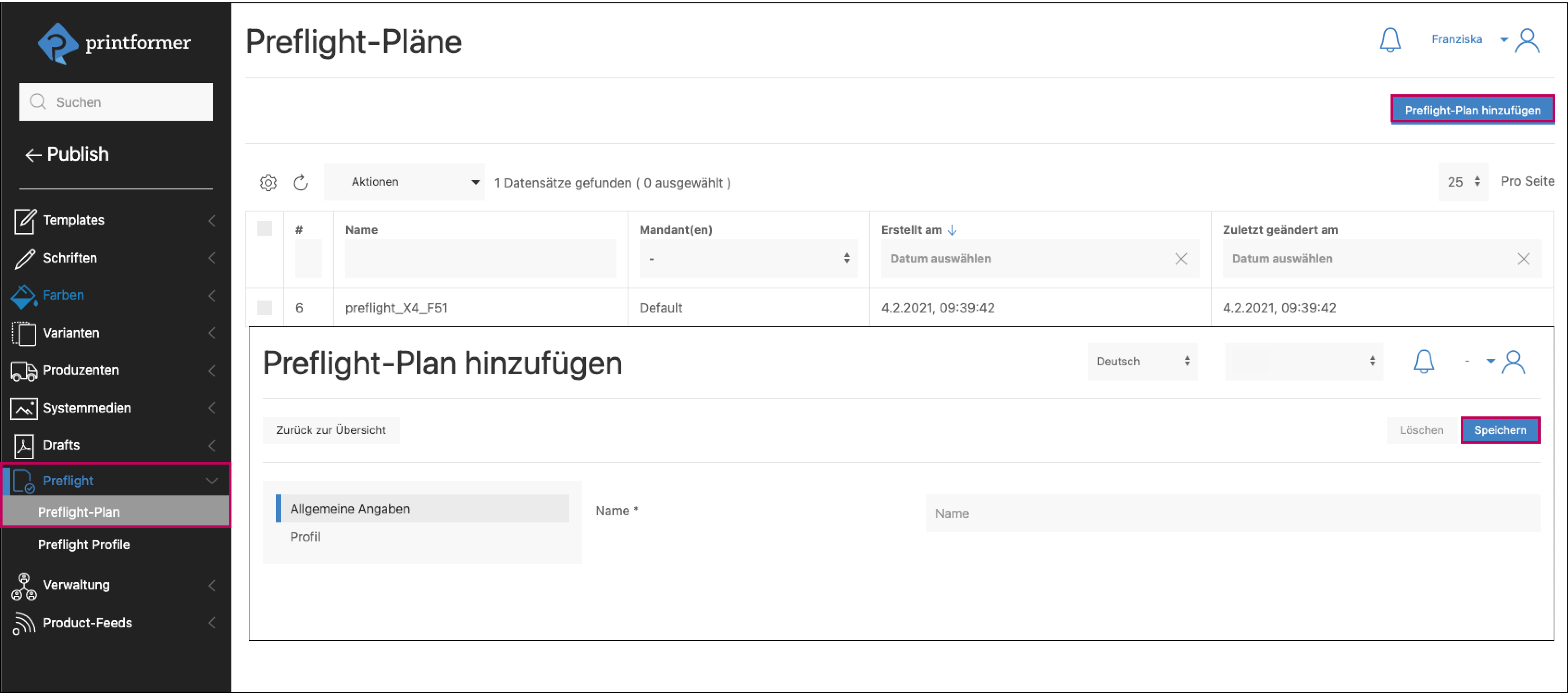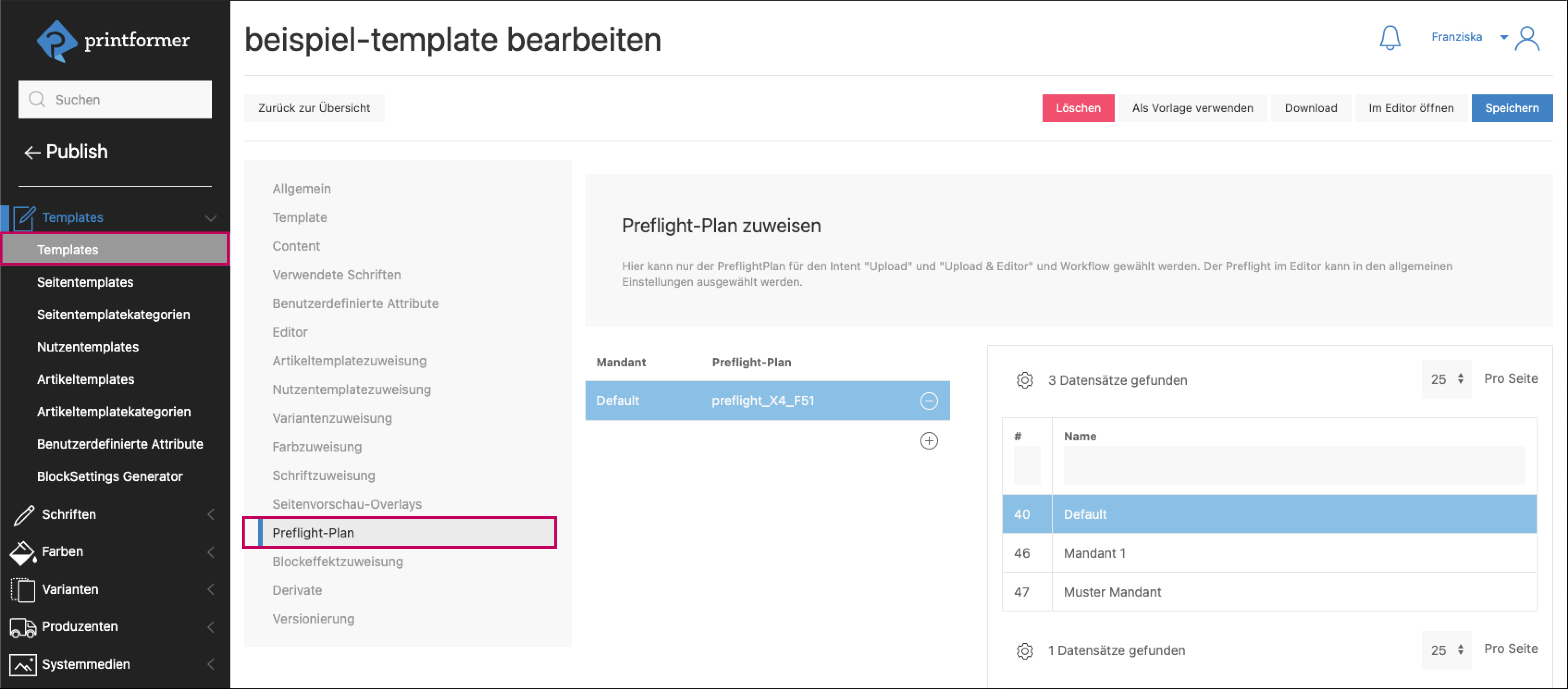 In der Template-Konfiguration werden unter Preflight-Plan die gewünschten Preflights dem Template (und Mandanten) zugewiesen.