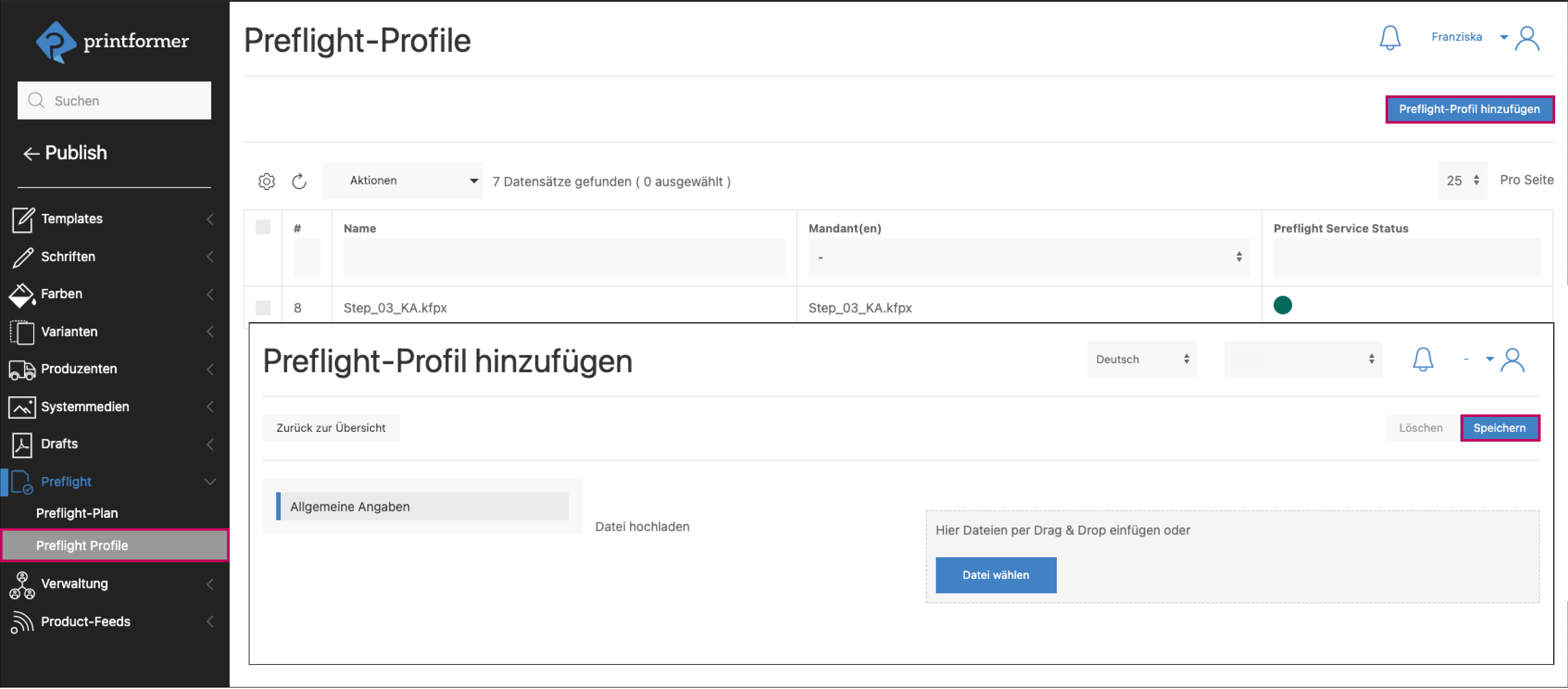 Über den Button Preflight-Profil hinzufügen werden die callas Preflight-Profile (.kfpx) hochgeladen.
