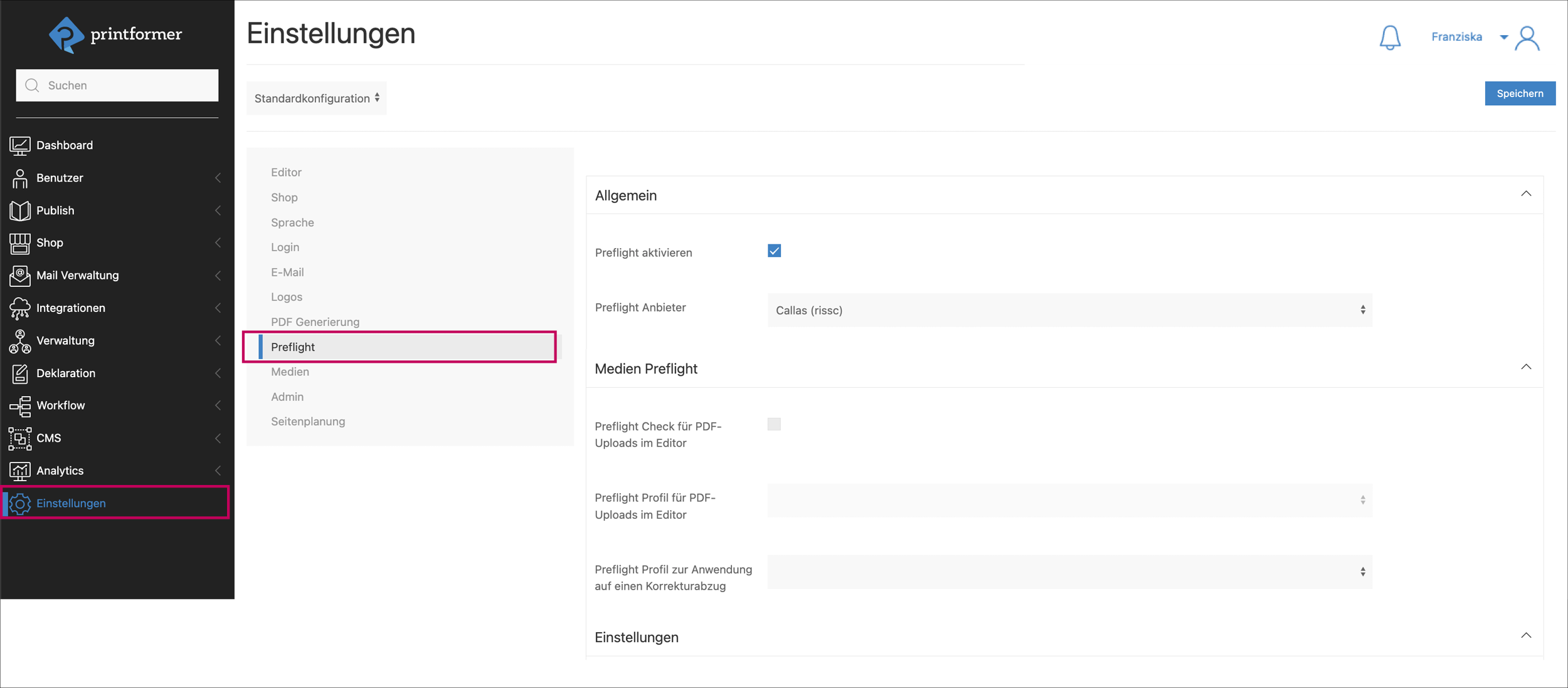 In den Preflight-Einstellungen wird zunächst unter Allgemein das Preflight aktiviert und der Anbieter ausgewählt (drop-down).