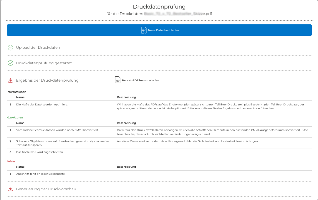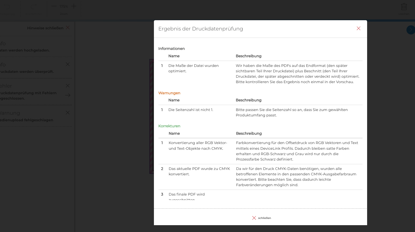 Um einen schnellen reibungslosen Produktionsablauf zu gewährleisten kann im printformer eine leistungsstarke PDF-Preflightengine integriert werden. Dadurch wird direkt nach dem Upload die hochgeladene PDF-Datei einem Preflight unterzogen. Eine anschließende Vorschau zeigt die geprüfte und korrigierte PDF-Datei direkt im Browser an.