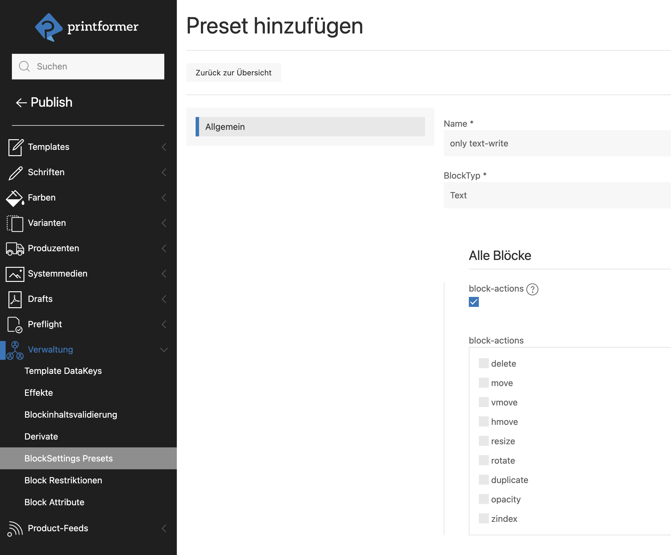 Sollen Settings oder Restriktionen für mehrere Templates oder mandantenübergreifend (jeweils für alle bestehenden der vom User hinzugefügte Blöcke) eingesetzt werden, ist dies über BlockSetting Presets und Block Restriktionen, die direkt in der Admin angelegt werden möglich.)