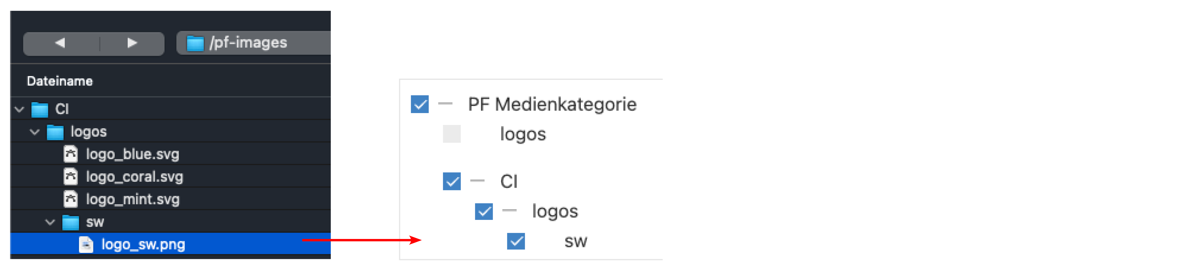 pf-images wäre die vorab unter “Quellen” konfigurierte Stammkategorie (in unserem Beispiel PF Medienkategorien). Die Kategorien haben die gleiche Relation wie die Ordner auf dem Remotesystem. D.h. logos ist eine Unterkategorie von CI, usw.