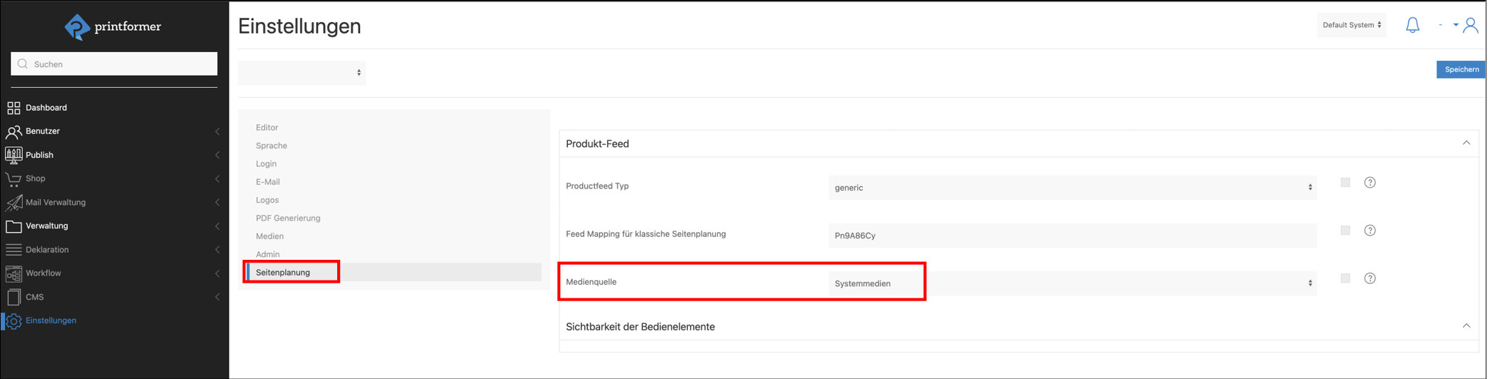 Wenn Seitenplanungen über die API anlegt werden und die Systemmedien genutzt werden sollen, muss in den Einstellungen (Einstellungen > Seitenplanung) die Medienquelle anpassen: