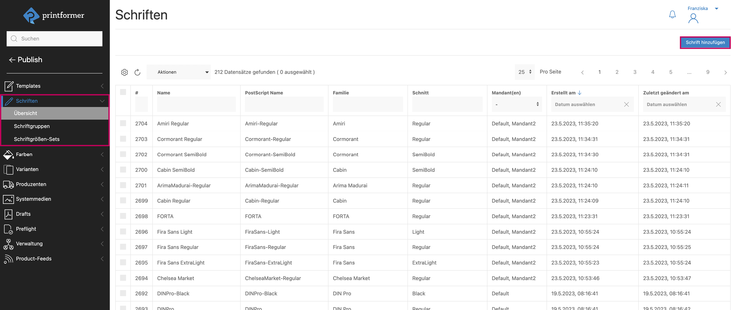 Unter dem Menüpunkt Schriften findet die Verwaltung der Schriftarten statt. In einer Übersicht werden alle vorhandenen Schriftarten tabellarisch aufgelistet.