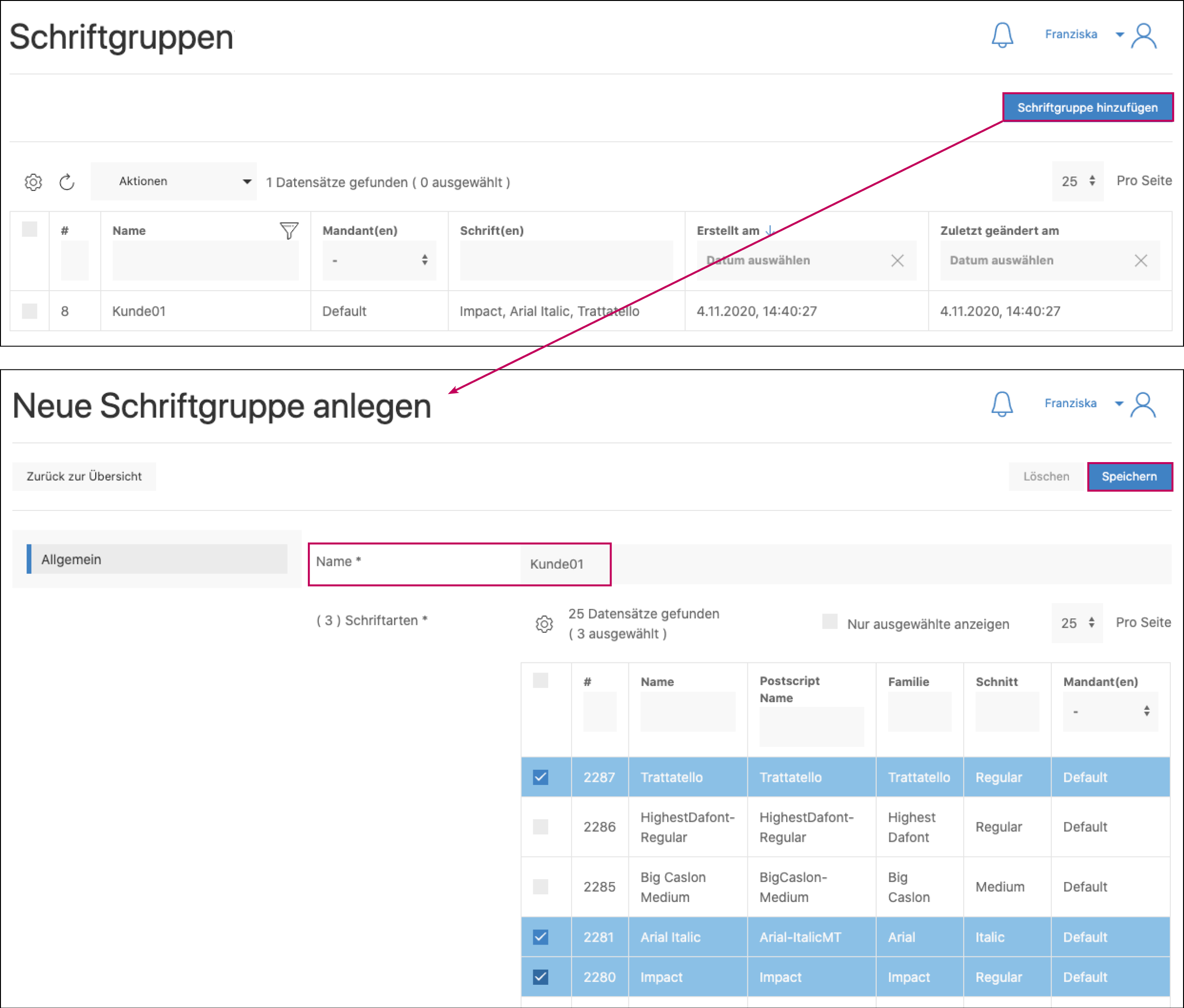 Dies geschieht unter dem Menüpunkt »Schriftgruppen«. Über »Schriftgruppe hinzufügen« gelangt man in die Bearbeitungsmaske Neue Schriftgruppe anlegen. Hier kann nun ein entsprechender Name vergeben werden, aus der angezeigten Übersicht können die gewünschten Schriften ausgewählt und unter »Speichern« die Schriftgruppe angelegt werden.