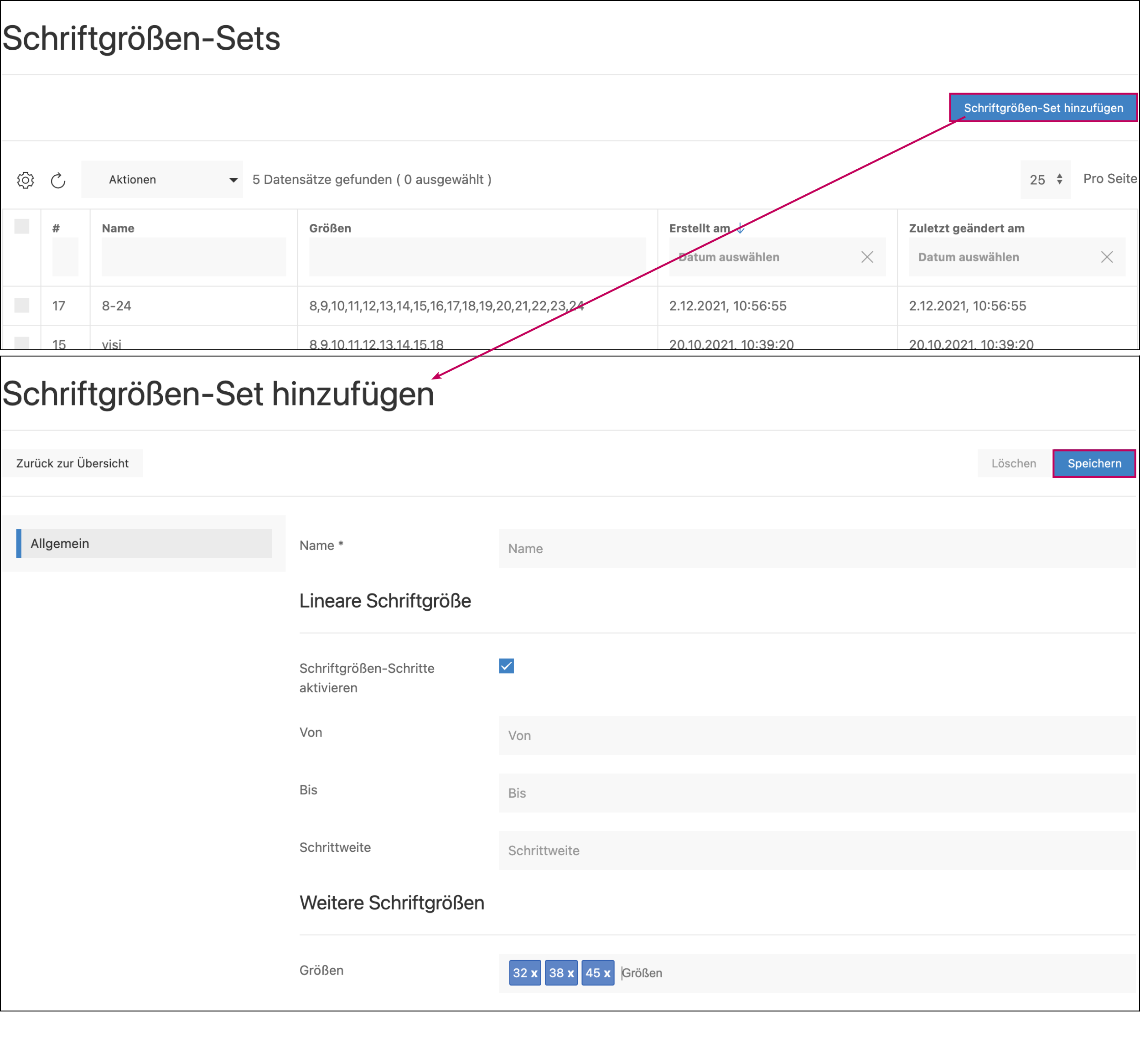 Genauso kann unter »Schriftgrößen-Sets« eine bestimmte Auswahl an festgelegten Schriftgrößen gespeichert werden. Die gewünschten Größen können dabei Linear (Eingabe von/bis) und/oder einzeln eingegeben werden.