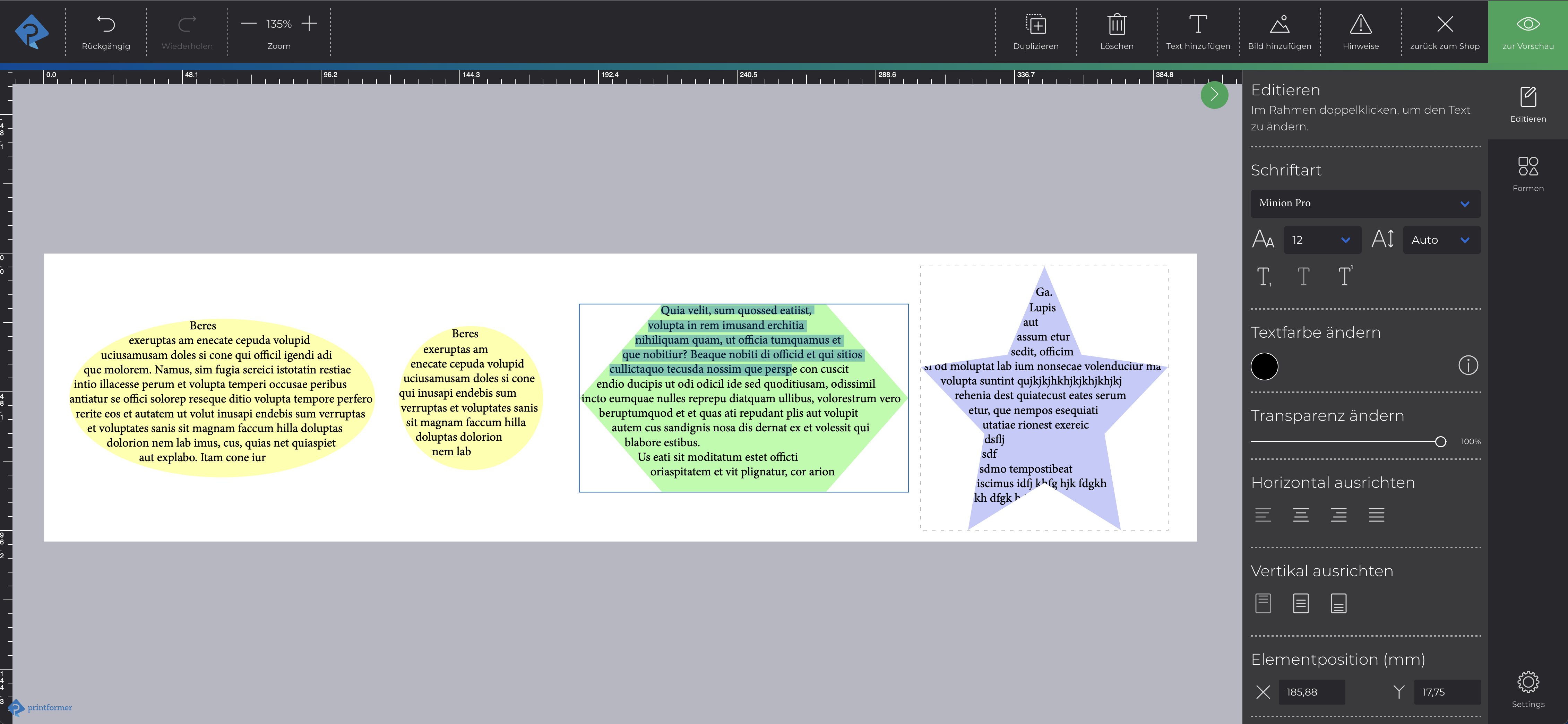 Für Textrahmen können freie Formen gewählt werden. Einschränkungen gibt es hierbei wenn der Text durch den Pfad unterbrochen wird (bspw. wird bei einer Sternform der Text dann abgeschnitten), s. auch Beispiel, oder wenn sich der Textrahmen nach unten verjüngt (bspw. Dreieck mit Spitze nach unten).