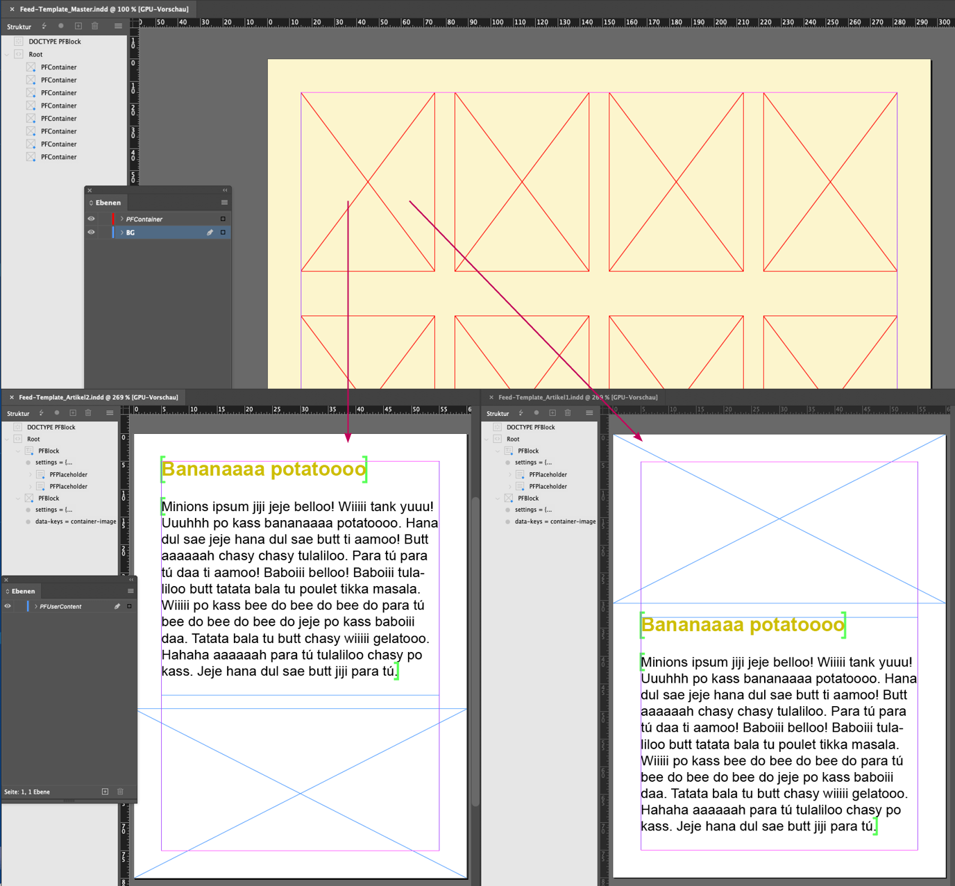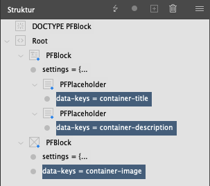 In der IDML werden alle Blöcke mit PFBlock getaggt. Für Texte werden Placeholder angelegt.