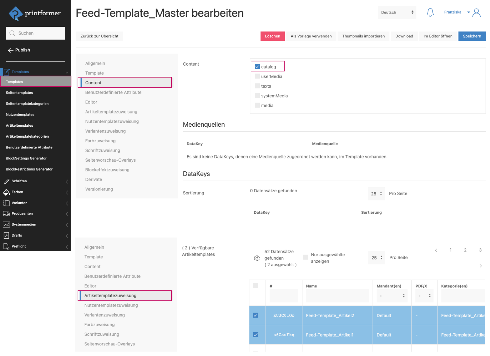 Und unter Artikeltemplatezuweisung werden die vorab erstellten Artikeltemplates ausgewählt.