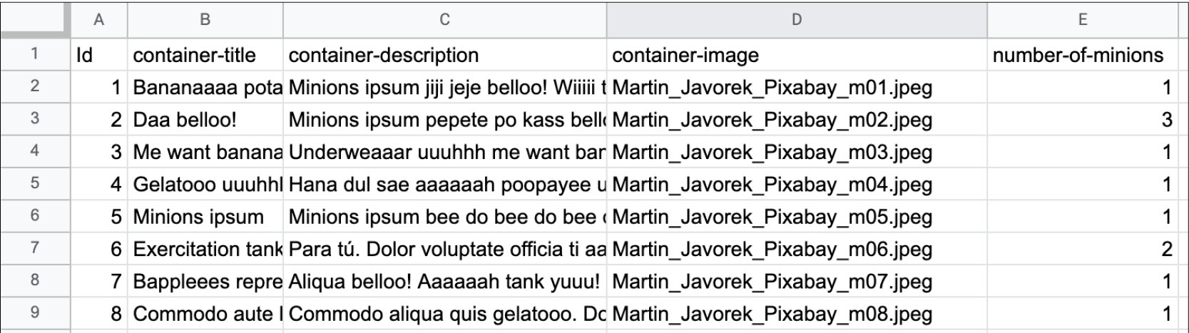 Diese befinden sich in unserer CSV-Datei als Spaltenüberschriften und werden entsprechend mit Text bzw. dem Dateinamen des jeweiligen Motivs gefüllt.