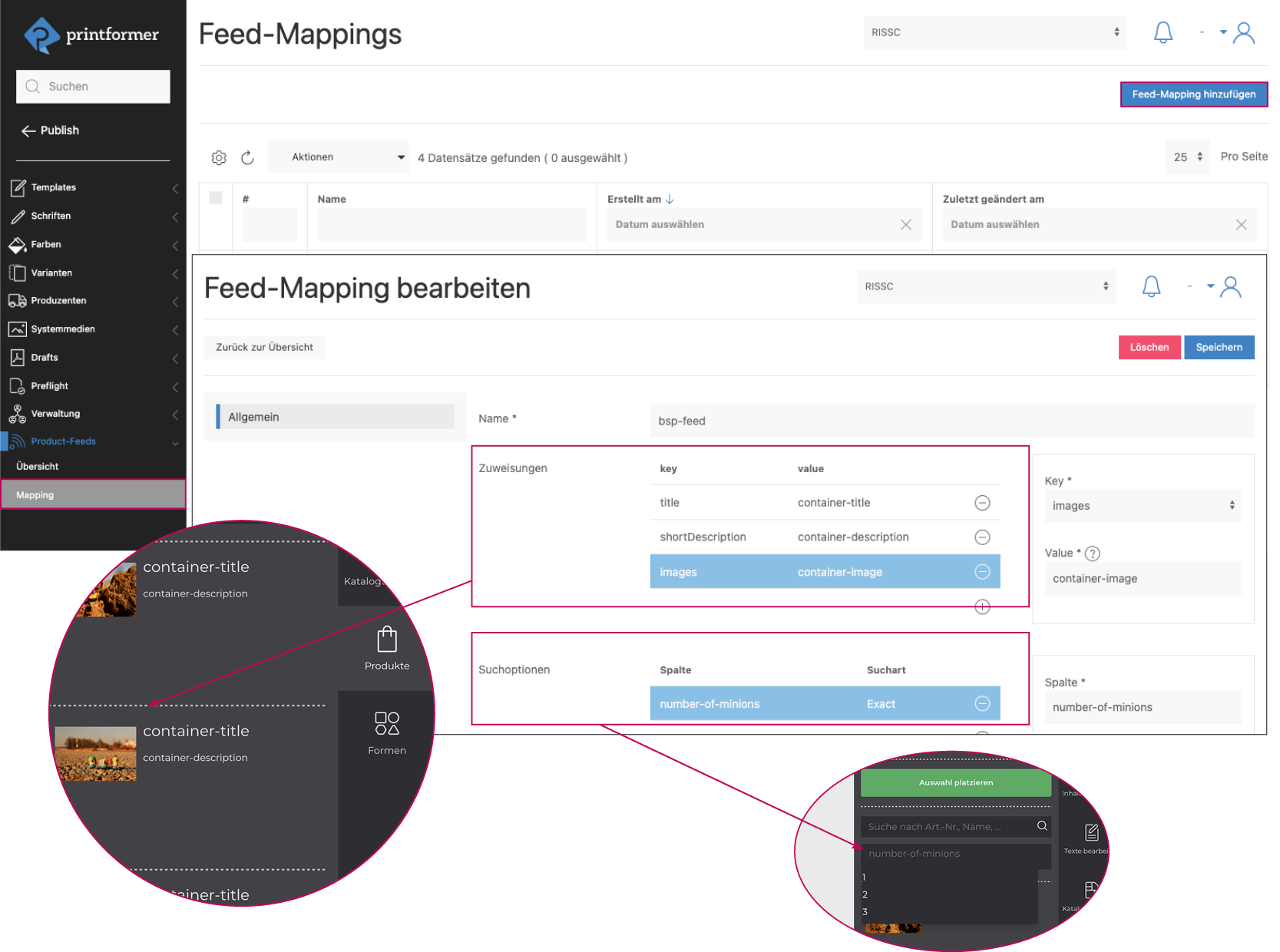 Hier wird festgelegt wie die einzelnen Produkte später im Menü Produkte der Sidebar des Editors dargestellt werden. Unter Zuweisung werden Keys (definiert über printformer) mittels Plus-Symbol hinzugefügt und dem gewünschten Value (definiert über CSV) zugewiesen.