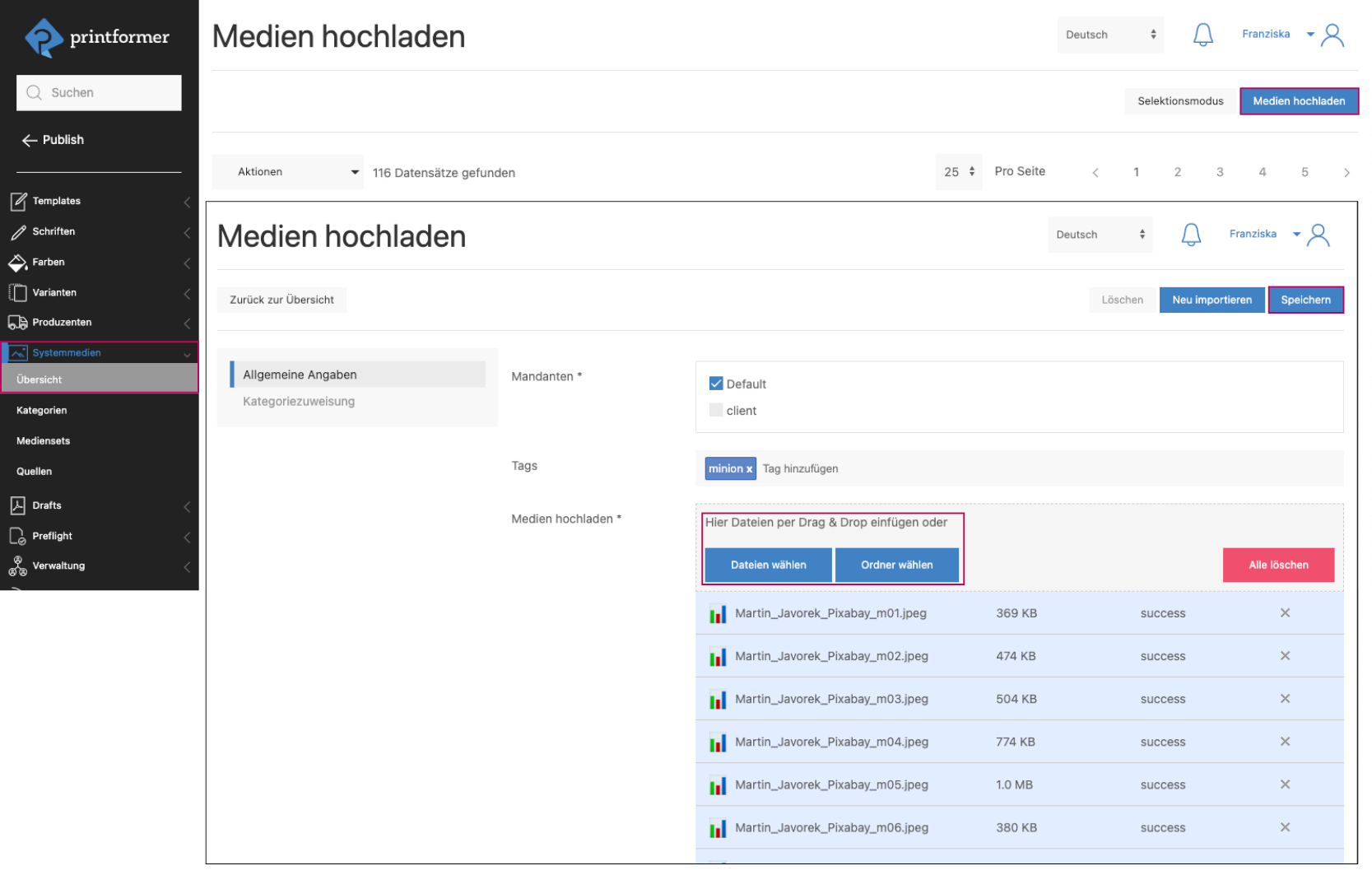 Damit die in der CSV-Datei aufgeführten Bilddateien auch (wie im Artikeltemplate definiert) zur Verfügung stehen, müssen sie in den Systemmedien hochgeladen werden (Publish > Systemmedien > Medien hochladen).