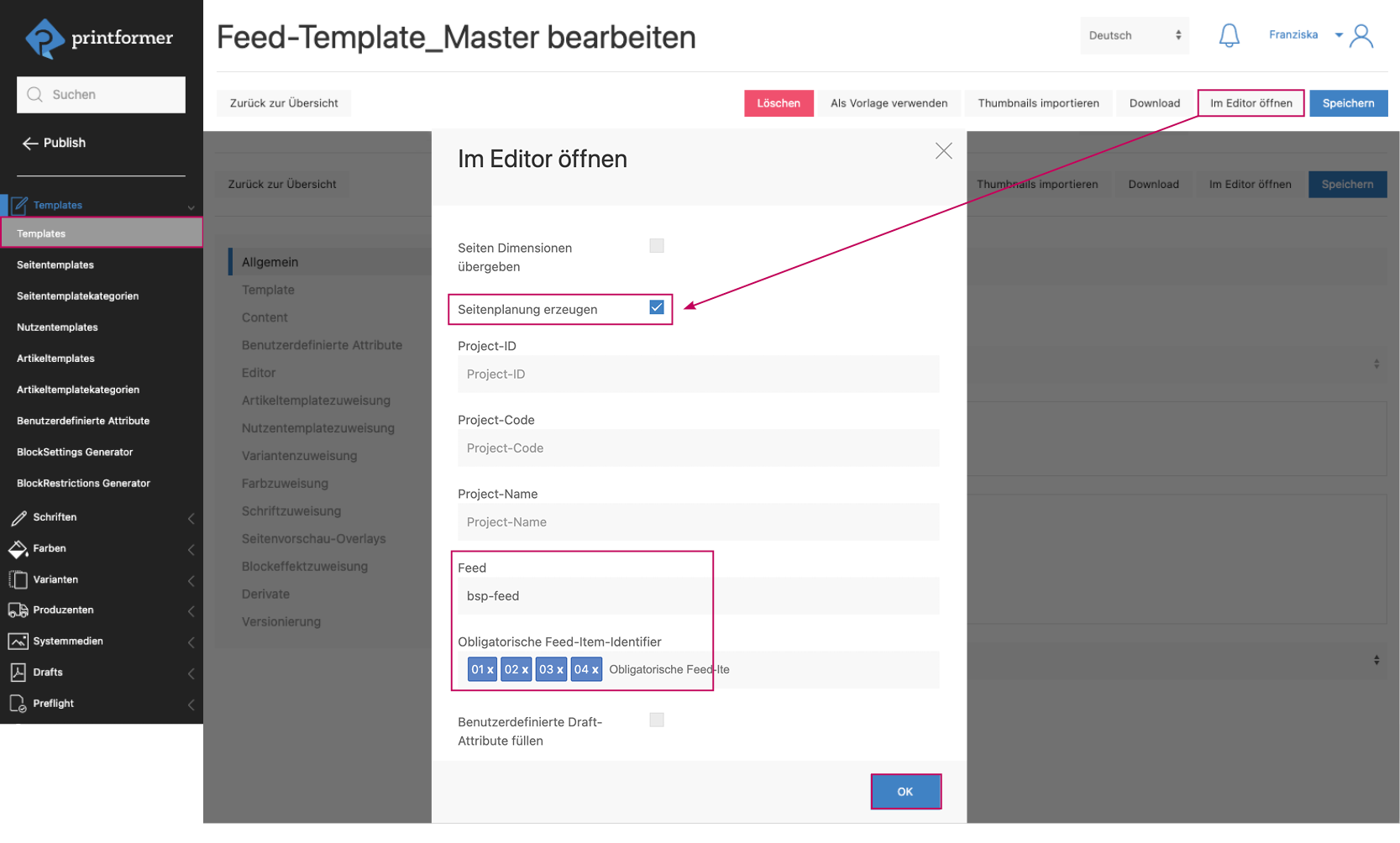 Alternativ kann auch direkt am Template der Feed definiert werden: Template > Editor > Seitenplanung > Immer eine Seitenplanung erzeugen auswählen und gewünschten Feed eintragen.