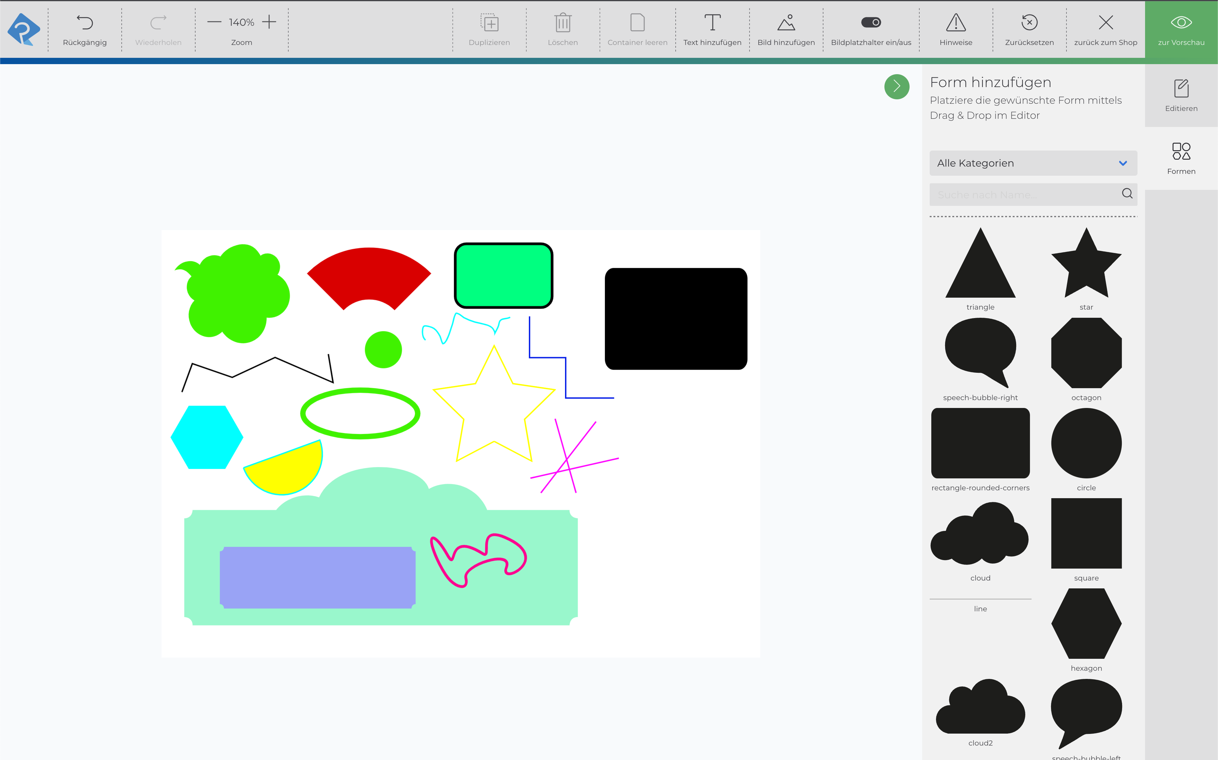 Einfache Formen können auch direkt im Editor über Form hinzufügen in das Template eingefügt werden. Diese sind skalierbar und deren Farbwerte (Flächenfarbe) können frei festgelegt werden (sofern dies durch ein Farbset nicht im Template eingeschränkt wurde). Eine Kontur kann nicht definiert werden.