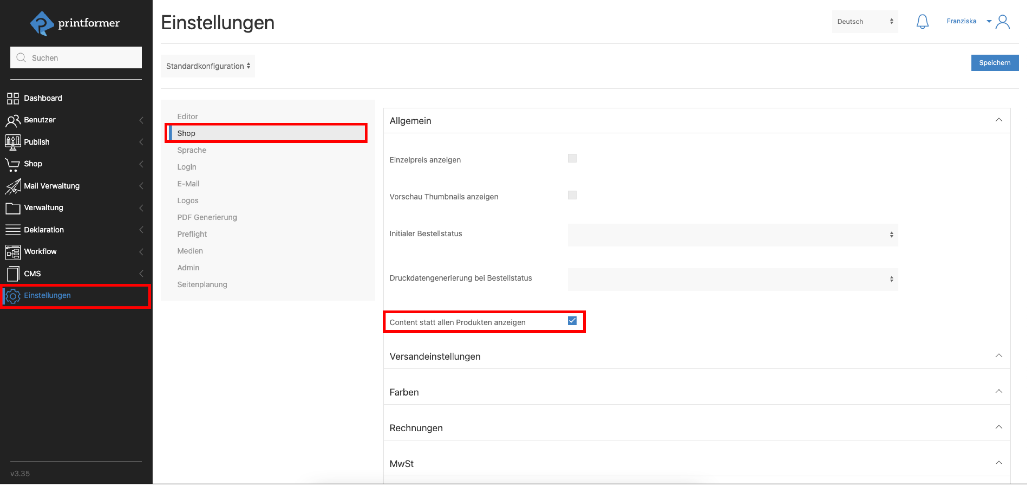 Um den Shop Content zu aktivieren muss folgende Checkbox in den Einstellungen aktiviert werden: